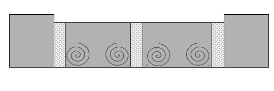 Eddie you answered most of my questions with the last post. I'm added a labelled photo of your spillway to clarify my questions/suggestions. The 2nd drawing is an attempt to show the swirling effect of the water inside the spillway walls. As the water rolls off the spillway, it will be spinning and probably erode more than just flowing water over grass. I see on closer examination that your ends are much higher than a 2x4 width. I think you said 8" higher.:thumbsup: