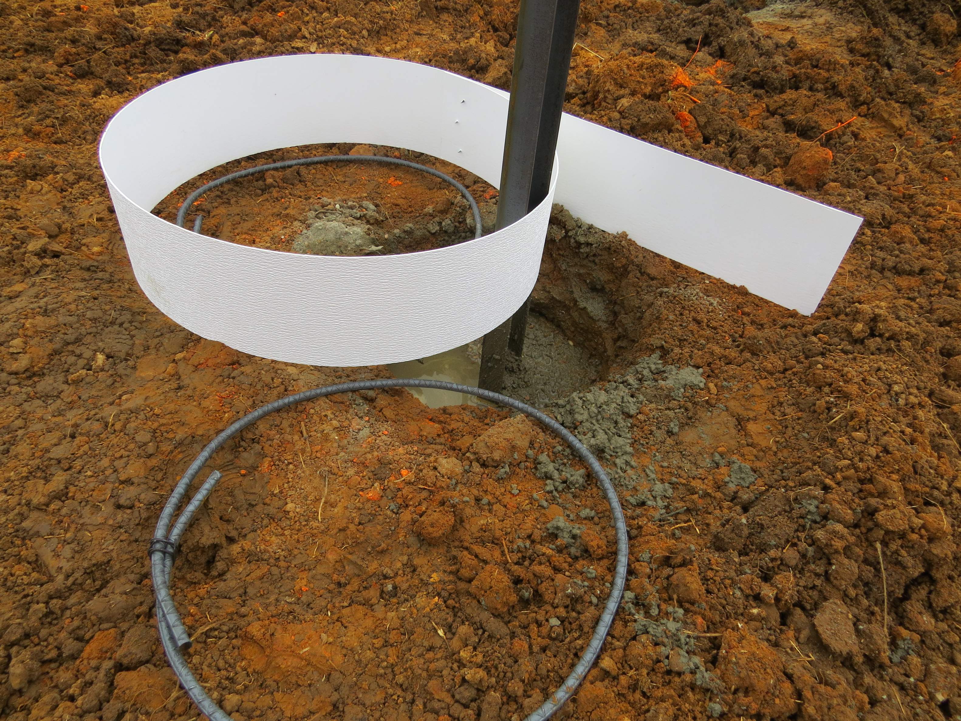 Each hole is 12 inches wide and 3ft deep. The C channel is 3 inches wide and five feet long. The forms are made from some plastic paneling type stuff that they use in mobile home showers and tub areas. Supposed to be water proof, but all I care is it bends real easy. I ripped it to 6 inches so I could get 8 forms out of one sheet. I then used some half inch wood screws to hold it together. Each footing gets 2 pieces of rebar that are five feet long and bent into a kind of circle. One goes in after a layer of concrete is poured, then the other goes in a few inches from the top.