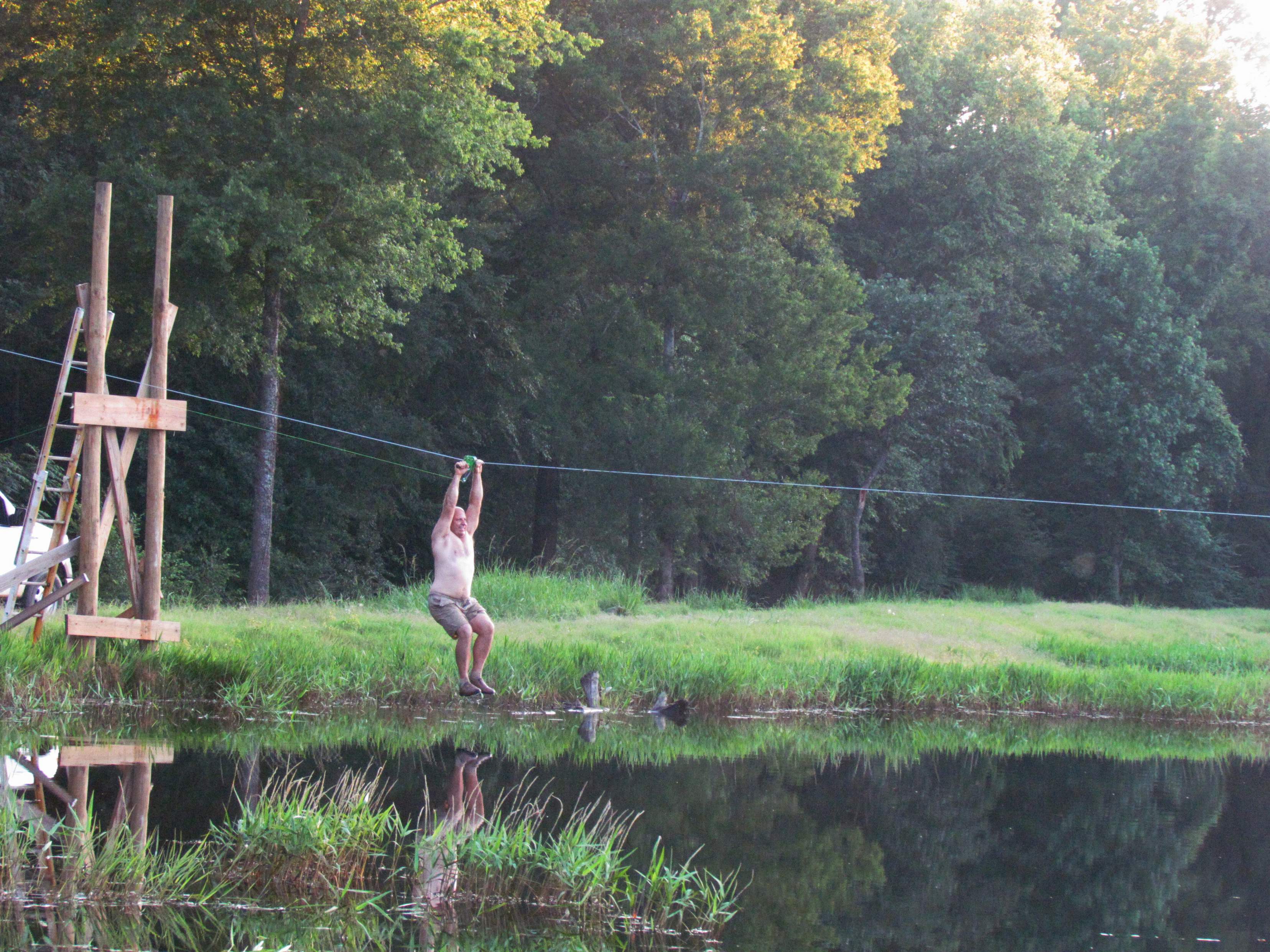 Karen's son was here, so we decided to see if we could get some work done on the zip line. My 24 foot ladder was about ten feet short at getting to where I wanted the cable to go, so I rented a towable lift. Once the cable was secure in the tree, we unrolled the cable and hooked it to the backhoe, where I tightened it up. I'm going to make a permanent anchor, but needed to know where to put it first.