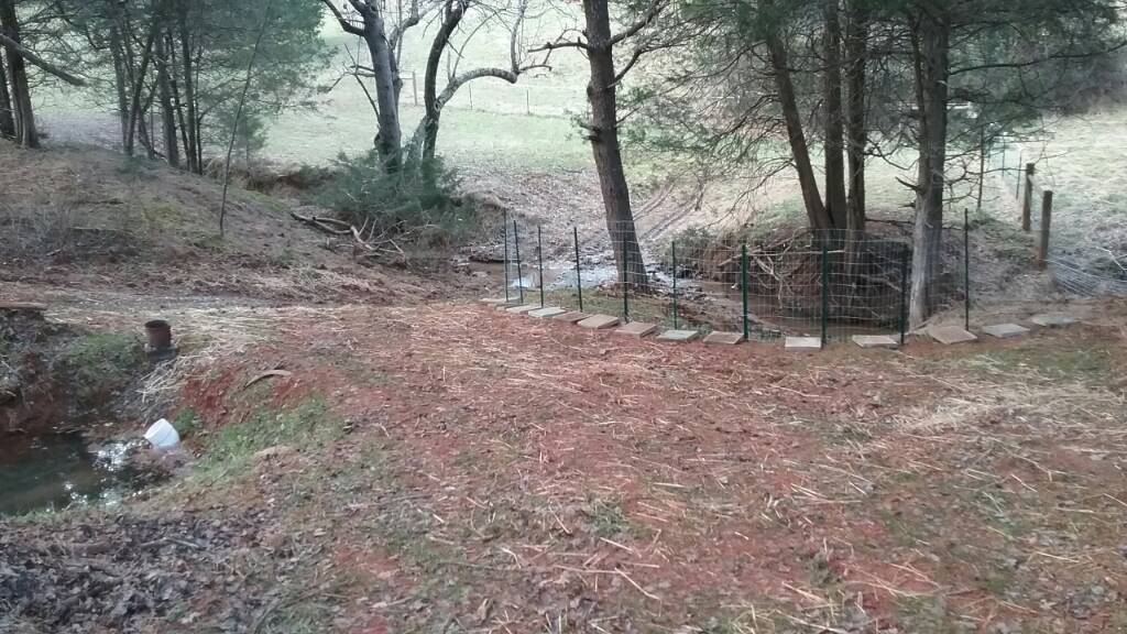 Now I want to put rip rap when it dries out on dam...one layer, then downhill and a lot in the creek. My idea of fence, wire, posts is stop erosion? Water will slow down coming down hill I'm hoping.