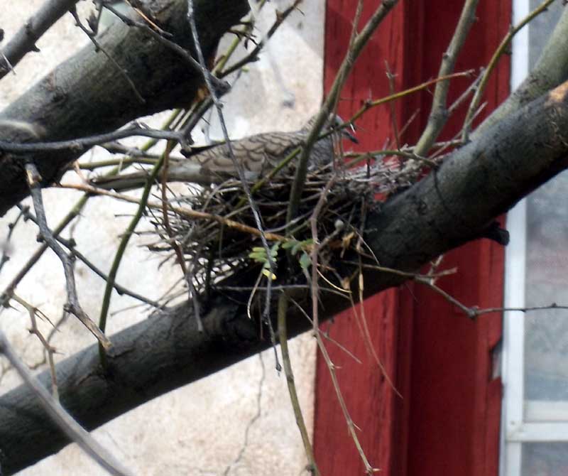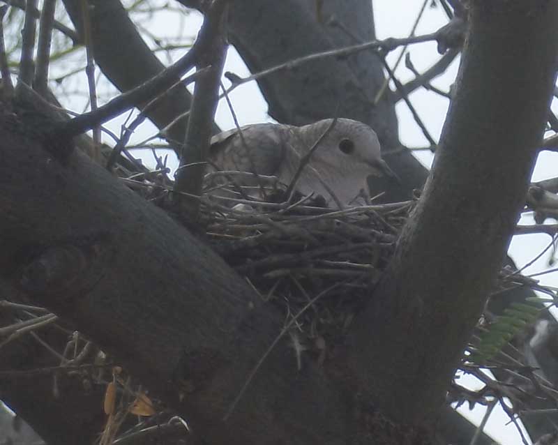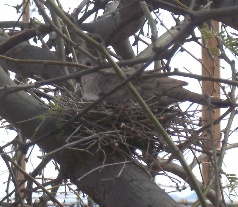 Have a fair number of Inca Doves. The picture is a mother on nest at neighbors house. Almost nothing can get one off the nest until the eggs hatch. Normal is 2 babies. In very few days they can fly if needed, but will sit the nest un moving for a few days. They can even be touched & still not move. Though 1 was dead in the nest pictured, lifted its beak & it just plopped back. But then blinked its eye. Gone 2 days later.