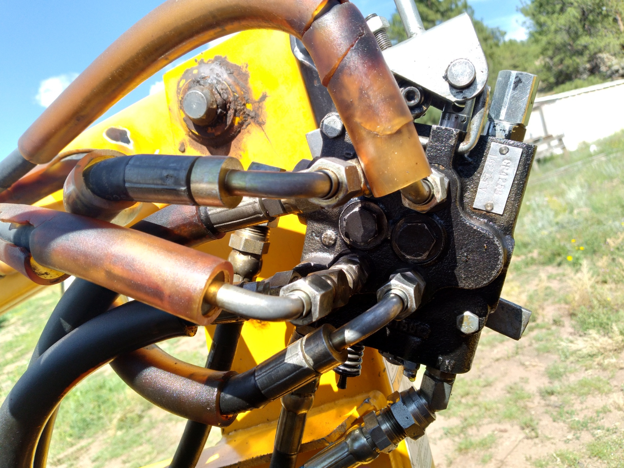 and 3 hoses back to the hydraulic block on the right side just foward of your feet. There's a pressure relief valve Tee-ed off the boom hoses right at the valve block so you don't try to lift too much. (416s have an integrated relief valve which has been problematic for many owners, who end up replacing the whole valve assembly with good one).