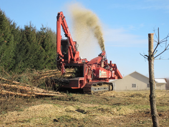 I wanted about 5 acres of Scotch Pine and Blue Spruce (ave 8" trunk), tree every 7' grid (~1800) because they were a fire hazard. I hired Homer Tree service to come in with a feller/buncher that grabs the tree while a big circular saw blade cuts close to the ground. Each tree takes about half a sec to cut and he could cut/grab 3 at one time before laying them down. Then they used a traveling chipper to stuff bunches of trees in and chipped them all. They then ran the Hydro-ax to level all stumps and brush. It also distributed the chips around the area. DONE!