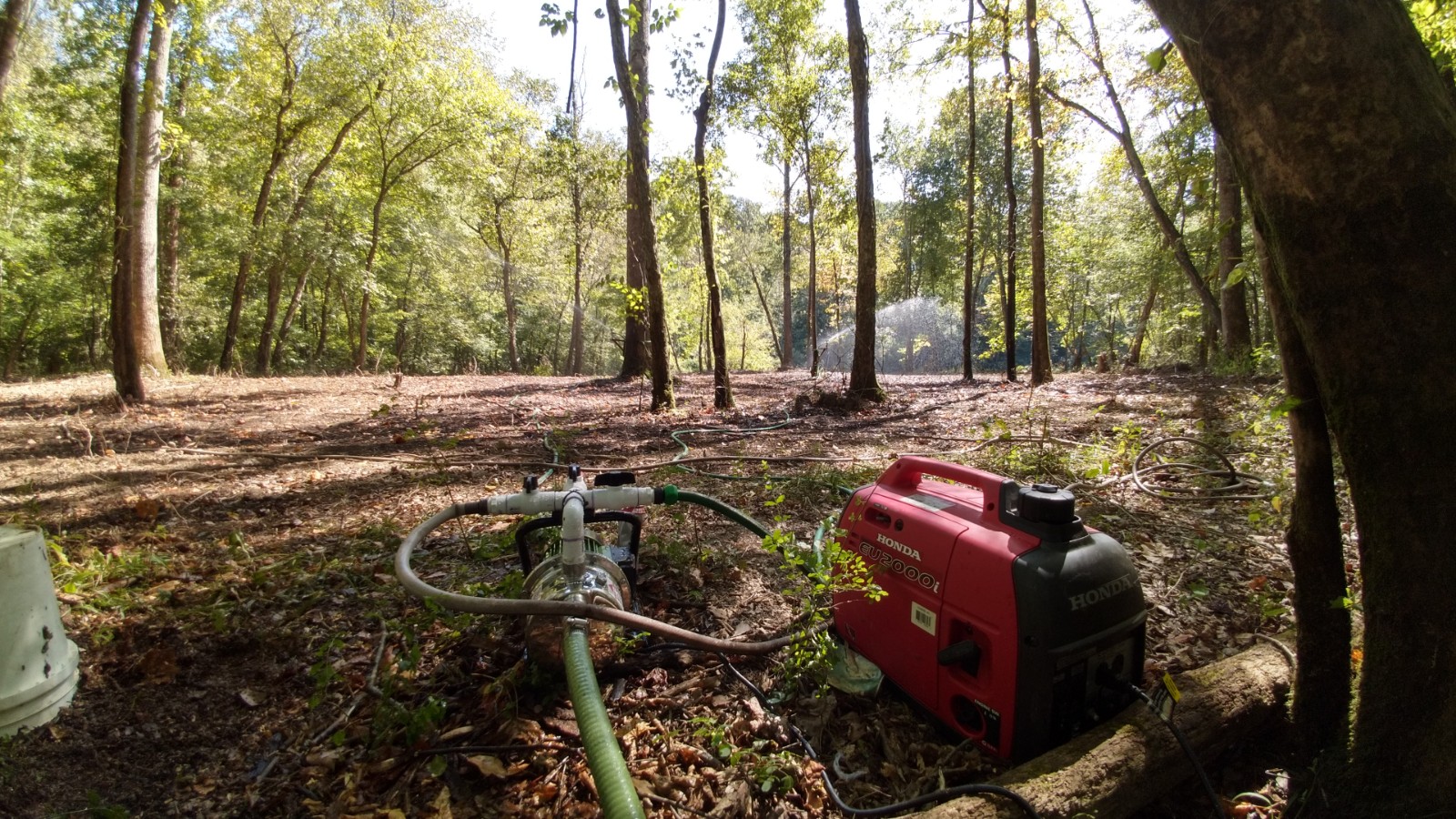 Yeah this weather is CRAZY! I have worked hard all summer to get my plot ready for this fall and the weather has totally derailed my plans. It is awfully hard to plat a winter food plot when it is hot and dry so I had to take matters into my own hands. I have a creek running just a few feet from my plot so I thought I would irrigate. Bought a HF irrigation pump and intake hose and set up some sprinklers.