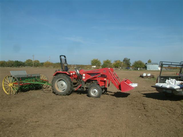- Kubota M6060, Bushhog 3210, Deere offset disk, Deere B drill, forks, bucket