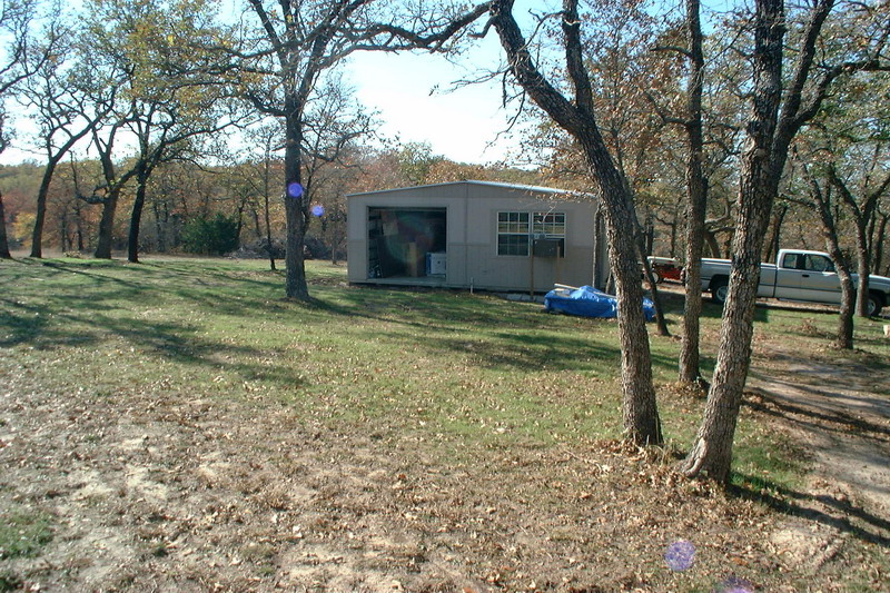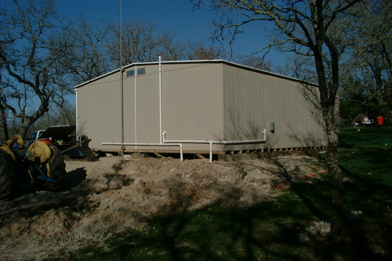I decided to buy a 24' x 24' portable building and finish it out as a cabin. I found a fellow near Fort Worth who built and sold several sizes and styles of buildings. He primarily sold kits to people to build their own, but he had a few buildings he had built and the 24' x 24' was for sale for $5k. The windows and doors were installed as was electrical and insulation. The building was actually two 12' x 24' sections (a double-wide portable building) with each section built onto skids. The fellow said he had a trailer for hauling the sections and would loan that to me for free if I bought his building. He would prepare the sections and load them out for me. All I would have to do is haul them to my place, unload them, and set them up. I had a relatively new 3/4 ton Dodge, so that seemed like a good plan. I got a hauling permit from the state and started early one Saturday morning at 7 AM. Because the sections were so wide and lightweight, I could not drive over 45 mph without the trailer setting up a fishtail motion. That's probably good, because I'm not sure the structure would have withstood faster speeds. However, at that speed, I was able to make two trips in one day, unload, and return the fellows trailer to him by 9:30 PM. WHEW! What a chore. I had hauled two big sections over 90 miles one-way to my property and unloaded them side-by-side without doing any damage.