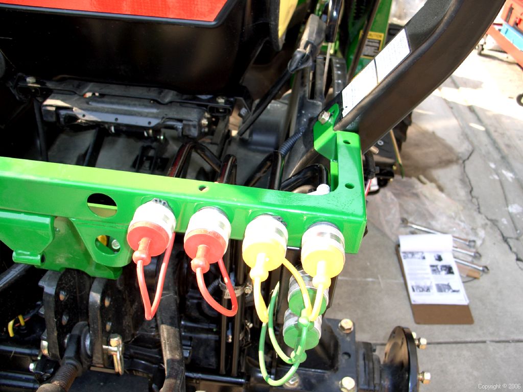 With the harness installed, now is the time to test the installation before buttoning everything up. Tractor started up fine and a quick peek revealed NO leaks -- hallelujia! But tractor dies shortly thereafter. Oh no, what gives. Oh yes, I forgot to turn the fuel line valve back on -- problem solved. Operated loader, no problems. Flipped diverter valve switch but it does not light, oh-oh. Sure enough, operating the joystick still operates the loader. Time to recheck the harness installation. Checked and rechecked -- everything A-OK. Tested for power at relay, OK. Hmmm. Tried it again and this time, pushed button more forcefully -- voila! Button lights up and circuit is diverted to rear remotes! Yes! The switch is a special 3 position design where there is an OFF-HOLD-ON with the on position being a momentary position. You must push down on the switch to the momentary ON position activating the valve. The switch then bounces back to the hold position where it remains (valve remains in divert position) until you turn it off. If you shut off the tractor while it is in the Hold position the valve will remain in the default mode (non-divert) until you activate it again by momentarily depressing the button to the on position. I guess this ensures that the tractor is always in the default position until you expressly activate the divert mode, no matter which position the switch is in when tractor is started.