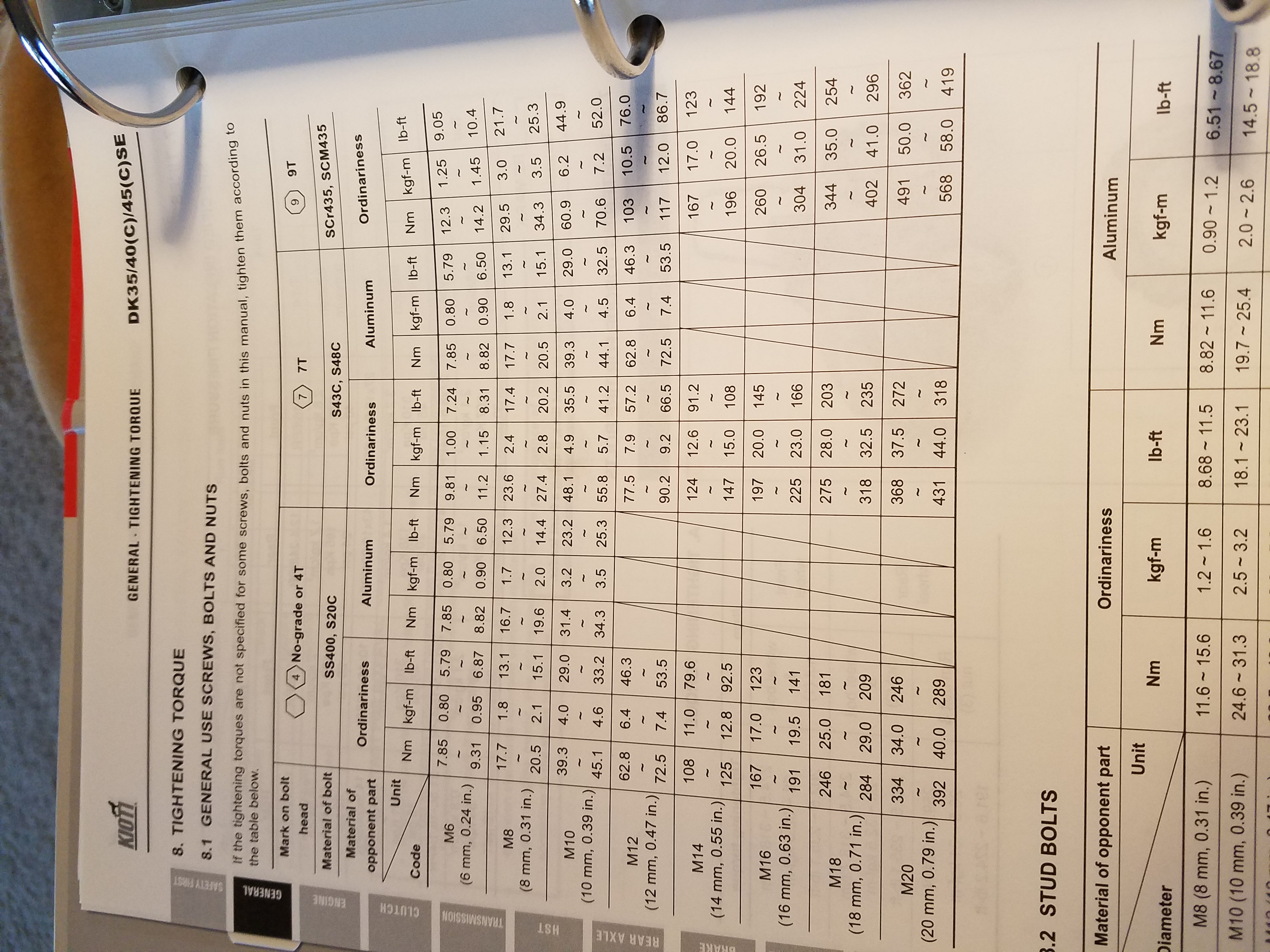 Rademamj1, thanks for the detailed and informative response. That all makes sense until I search for "Grade 9 Metric bolt torque" - then I come up empty. I find plenty of information on SAE sizes, but nothing for metric in Grade 9.