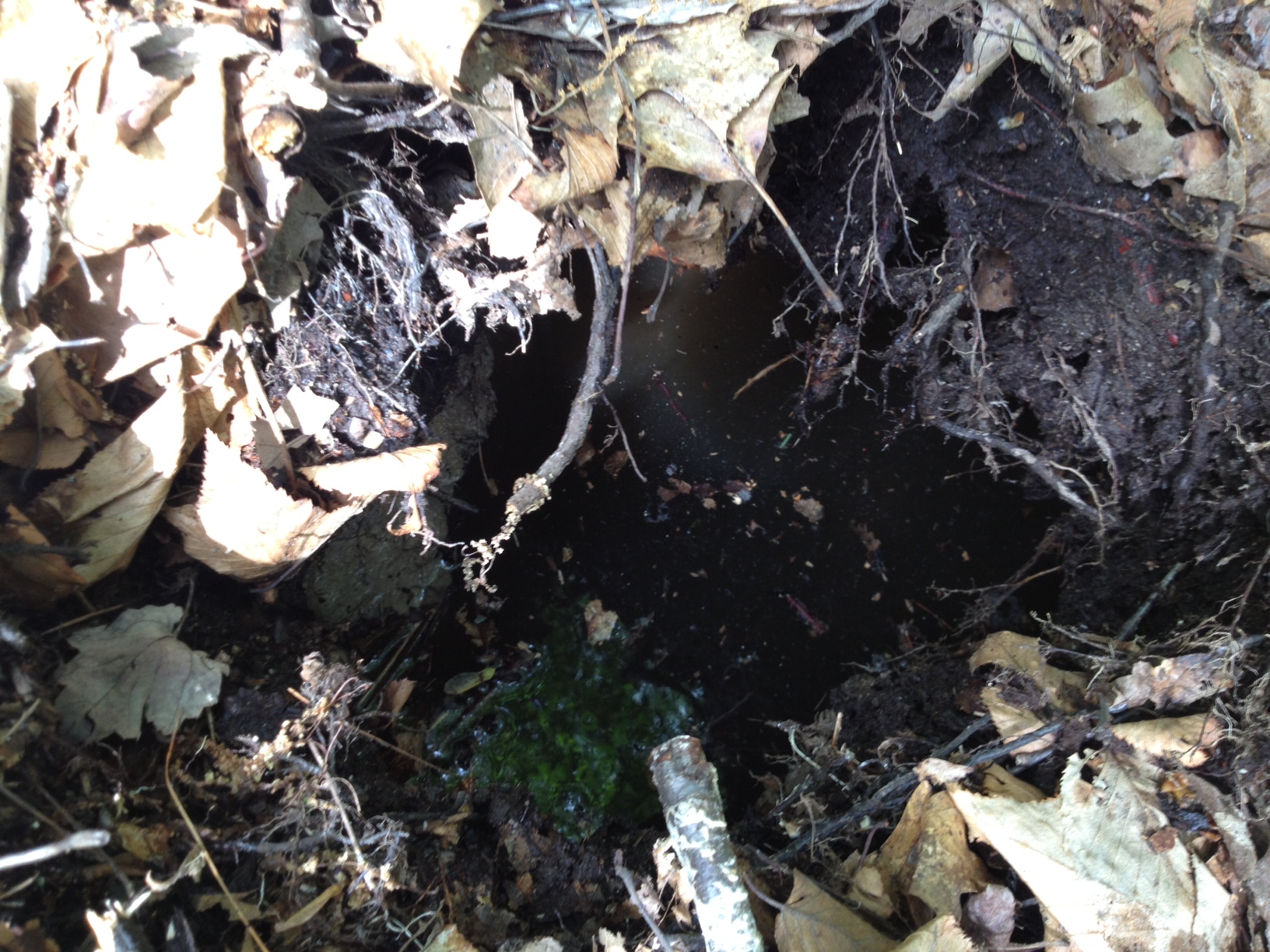 Inside the hole. The water is pretty clear and the level is about 6" under the level of the ground, the top level is being supported mostly by tree roots.