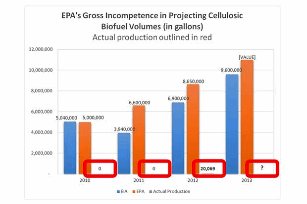 The EPA argues that more companies are building cellulosic ethanol plants and that more of these plants will produce ethanol this year. This may be true, but it was also true in 2010, 2011, and 2012. In those years the EPA projected that 20,250,000 gallons would be produced, but only 20,069 gallons were actually produced. In fact, the closest the EPA has come to accurately project cellulosic ethanol production was in 2010勇PA's first and lowest projection. In its subsequent forecasts, the EPA apparently learned nothing from history.