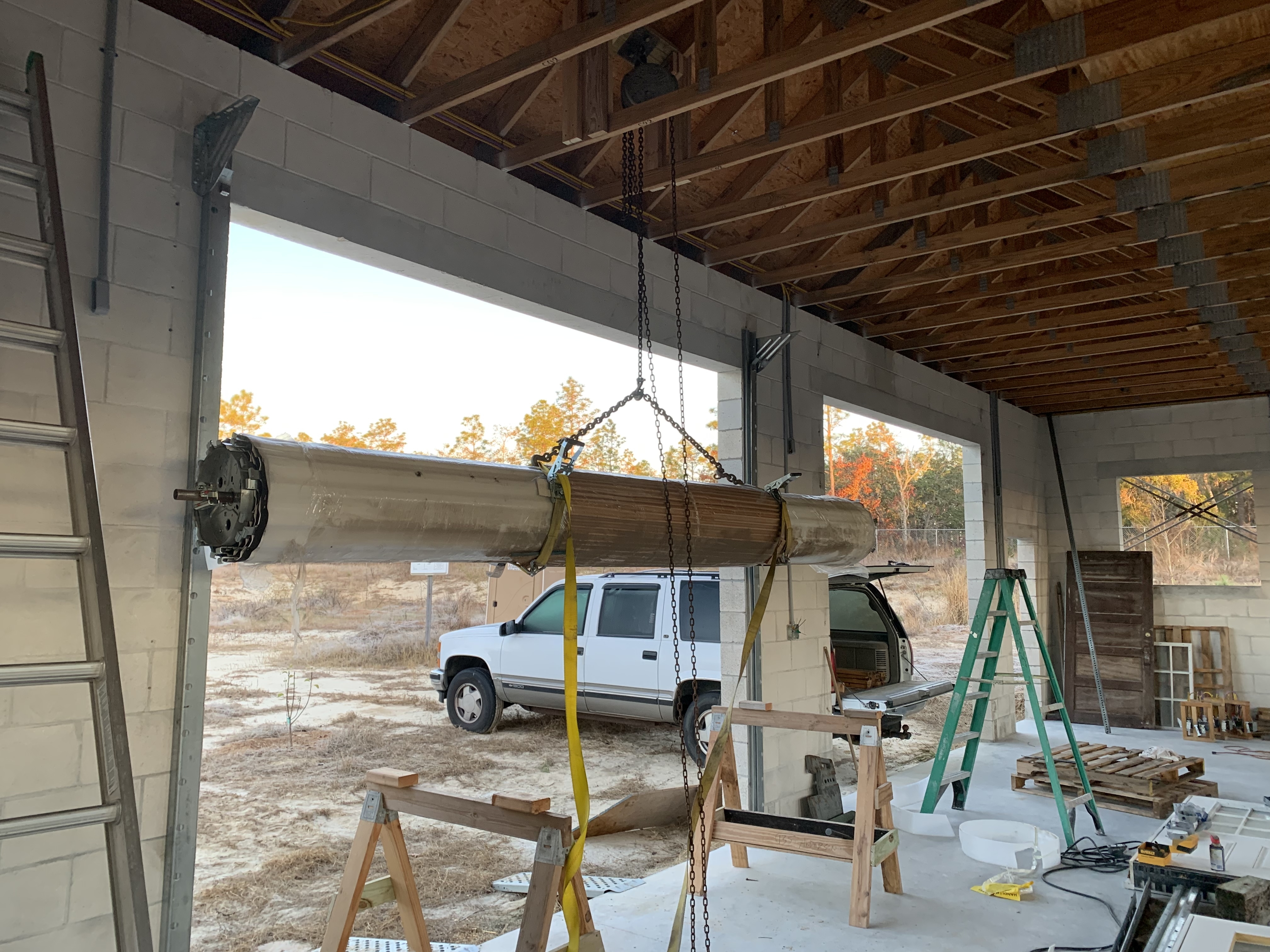 Good luck with not destroying the trusses with that chain fall. Trusses aren't designed to take a vertical load, why in my shop I put a steel I beam lengthwise for the overhead crane. My beam is fastened to the sill plates that carry the trusses. I had a 1/4" thick x 6 foot long steel plate sheared that I welded pockets to, to carry the beam and the steel plate is lag bolted to sill plates with 12 lag screws spaced out.
