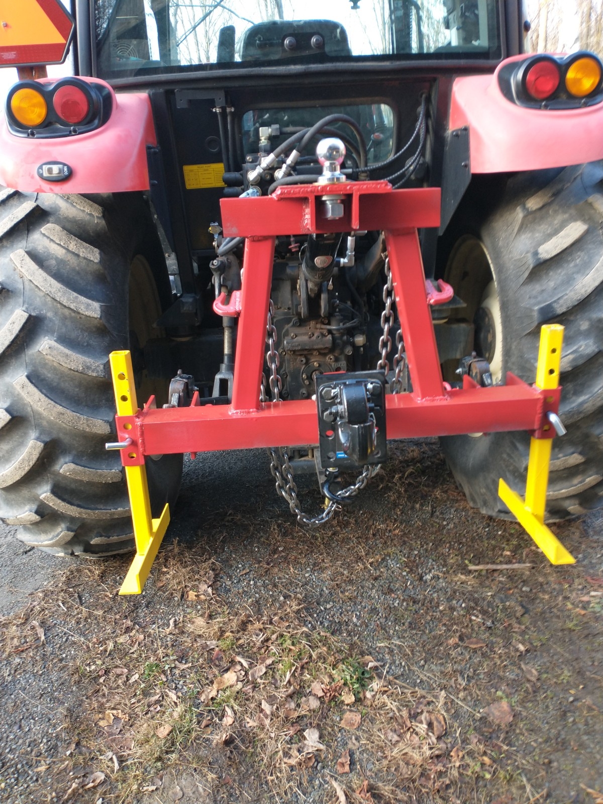 This was the second build for handling most all trailers, the yellow legs are just pined so they are easy to remove or repin with the base higher in the air. They can be removed or left on as desired and they also help hold the hitch up for hooking up to the tractor with or without a trailer attached.