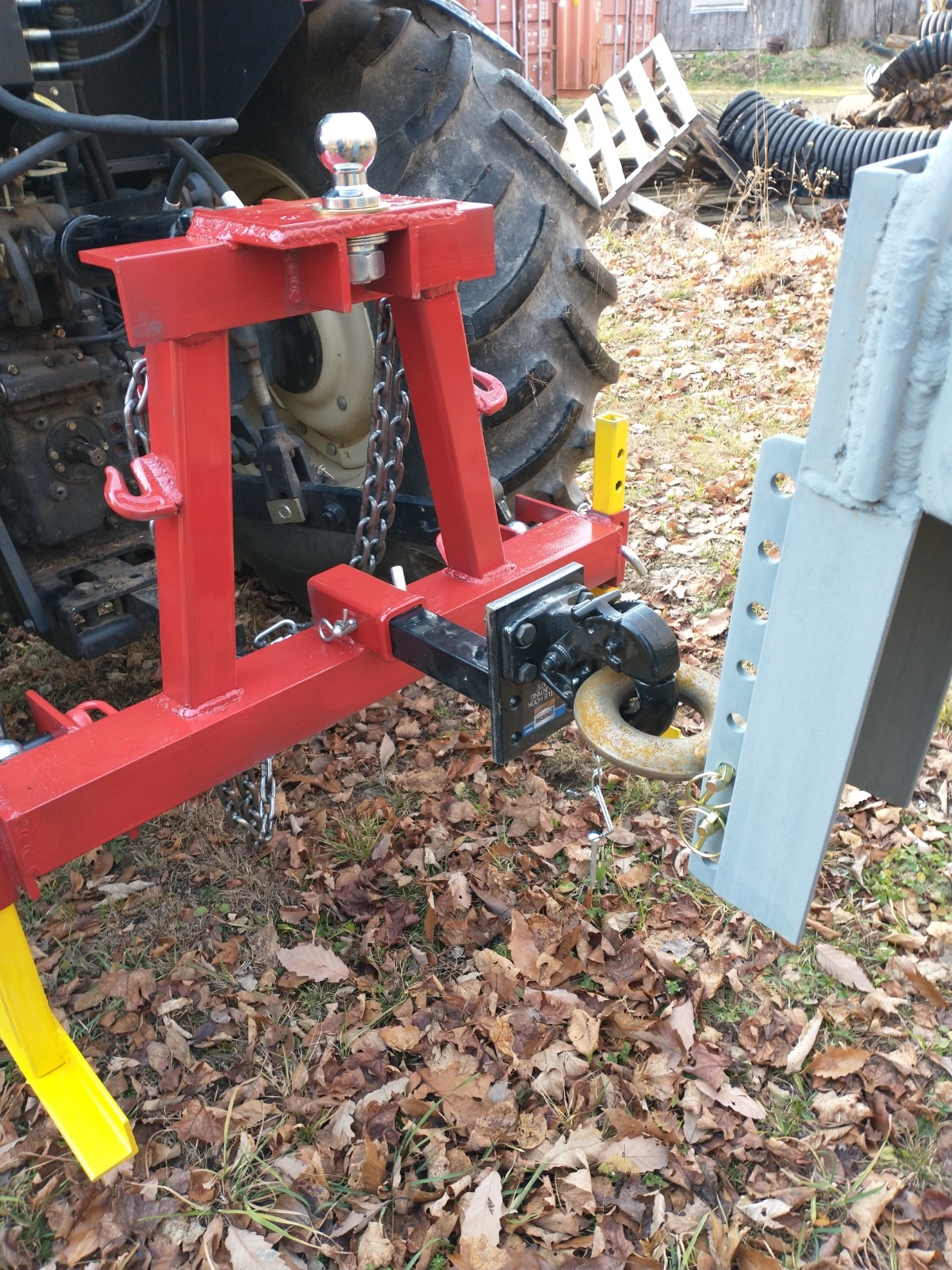 With no fixed drawbar it could be difficult to get a safety chain on that to prevent the trailer from lifting the lift arms. If you want to see what I mean raise your 3 point all the way up then give a good upward heave on that trailer ball and see what happens.