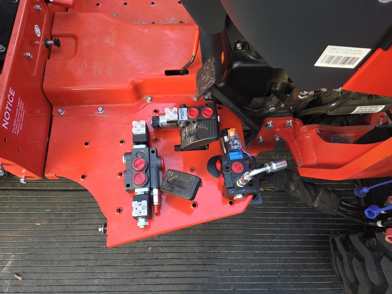 I'm planning to install a second loader valve on my T233, to control top and tilt on the 3-pt. I was thinking of using two diverter valves on the rear remote line. Then I found an eBay listing for a couple of the control valves for my tractor, NOS from the inventory of a closed TYM dealer. And decided that I could use a second control valve mounted at the right rear fender, to control the top and tilt.