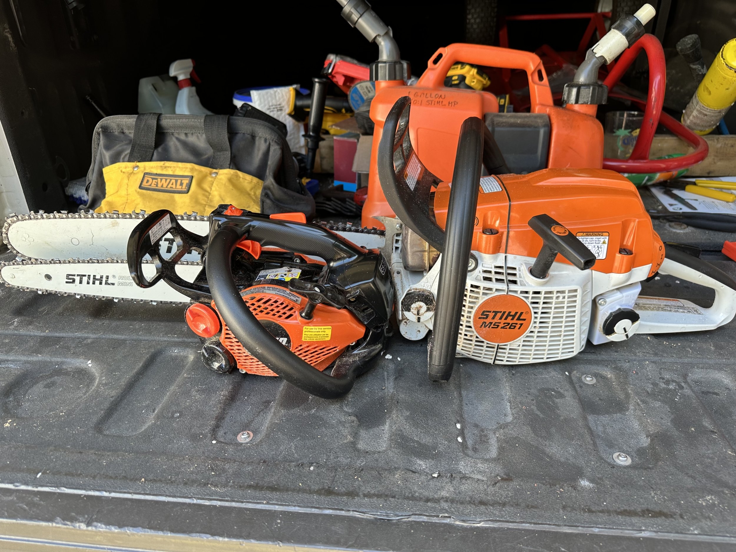 Actually, the Stihl top handle arborist saw is just as light and easy to start and probably a bit better build quality as well but the price is the knocker at 700 bucks. I know I had one and ran it over with the bucket truck and I wasn't about to buy another one for that price and I sure wasn't going to buy a Chinese saw either. The Echo and the Stihl are clamshell engines anyway and I presume the Chinese Farmtek is as well. Interestingly the little Echo is the only saw I own with a primer bulb.