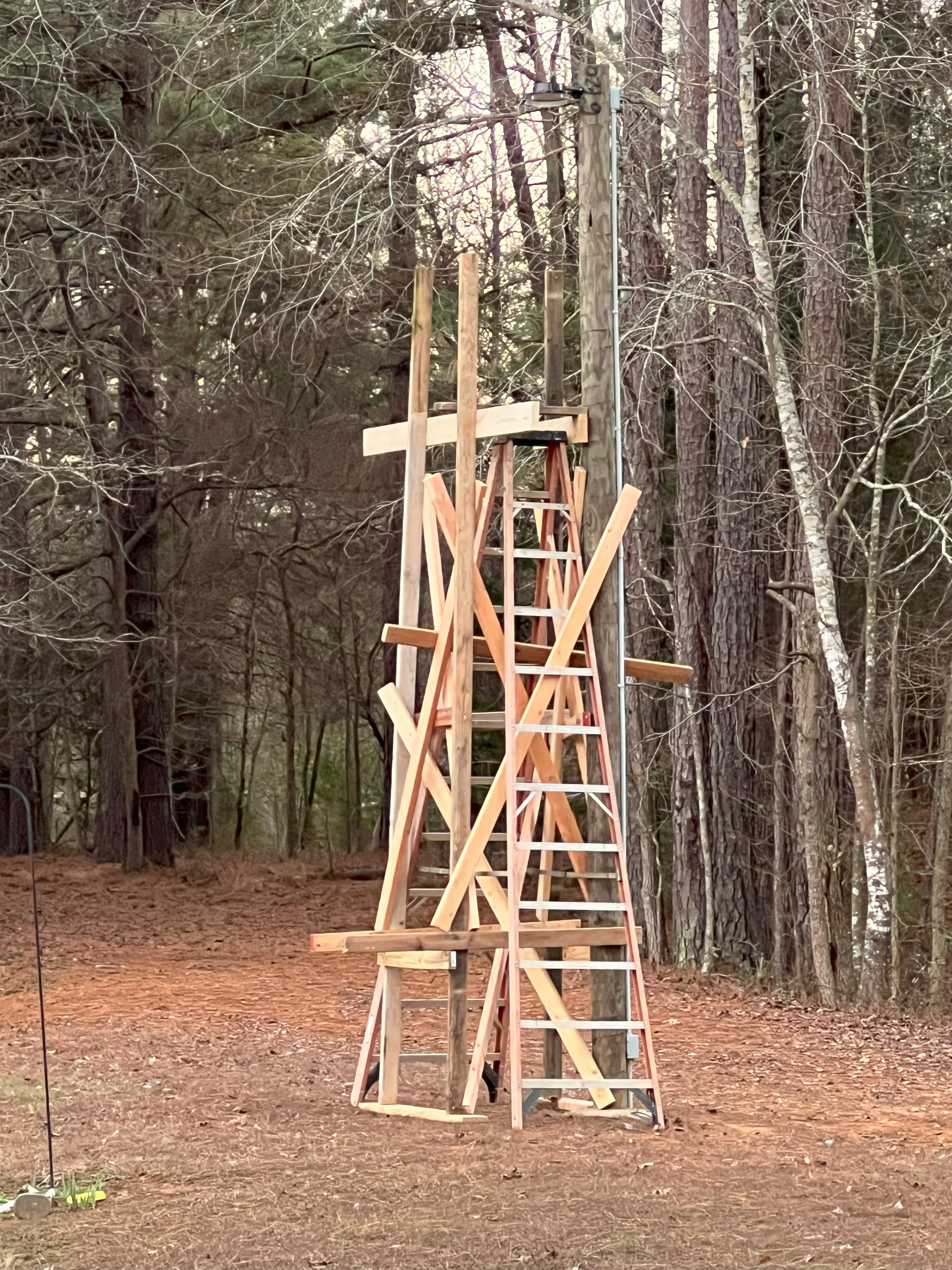 For Christmas, I bought my wife a new light and promised to make it a priority to change it. The light is 17 feet off of the ground, and it terrifies me to get up that high and swap lights. I built a tower from lumber lying around to make my 12 foot step ladder as solid as possible. I don't like heights, but if I'm on something solid, I can deal with it.