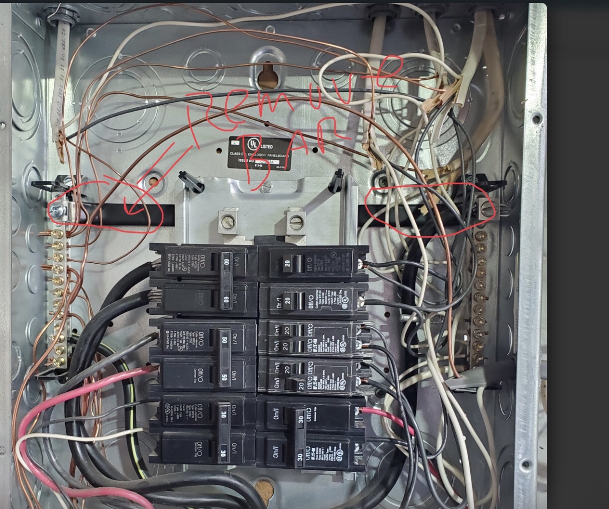 After removing the jumper from neutral bar to ground bar you need to bond the ground bar to the panel. Using the bond jumper from the right side of the panel. Looks like it is just holding the neutral wire to back of panel.