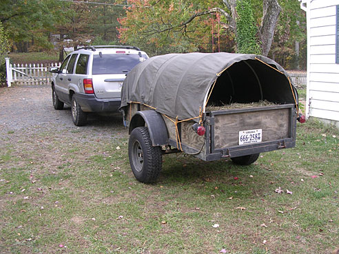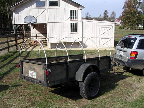 I did enclose my trailer for sheep transfer. To hold the tarp up, I used electrical gray conduit which is bit soft but it worked very well. The conduit slips into piece of steel pipe welded on the side of the rail.