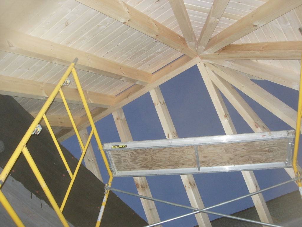You can't really see how it ties in anywhere now that the ceiling is done and the false wall is built. (from the slant of the original roof to this new ceiling, they built a false log wall so the vertical wall would go from floor to ceiling)