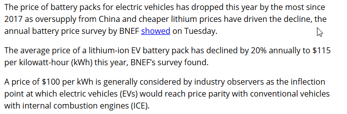 Been Following Tesla battery tray prices, as expected now that there are millions of Model 3 and Y's on the road, used pack prices are falling like solar panel prices.