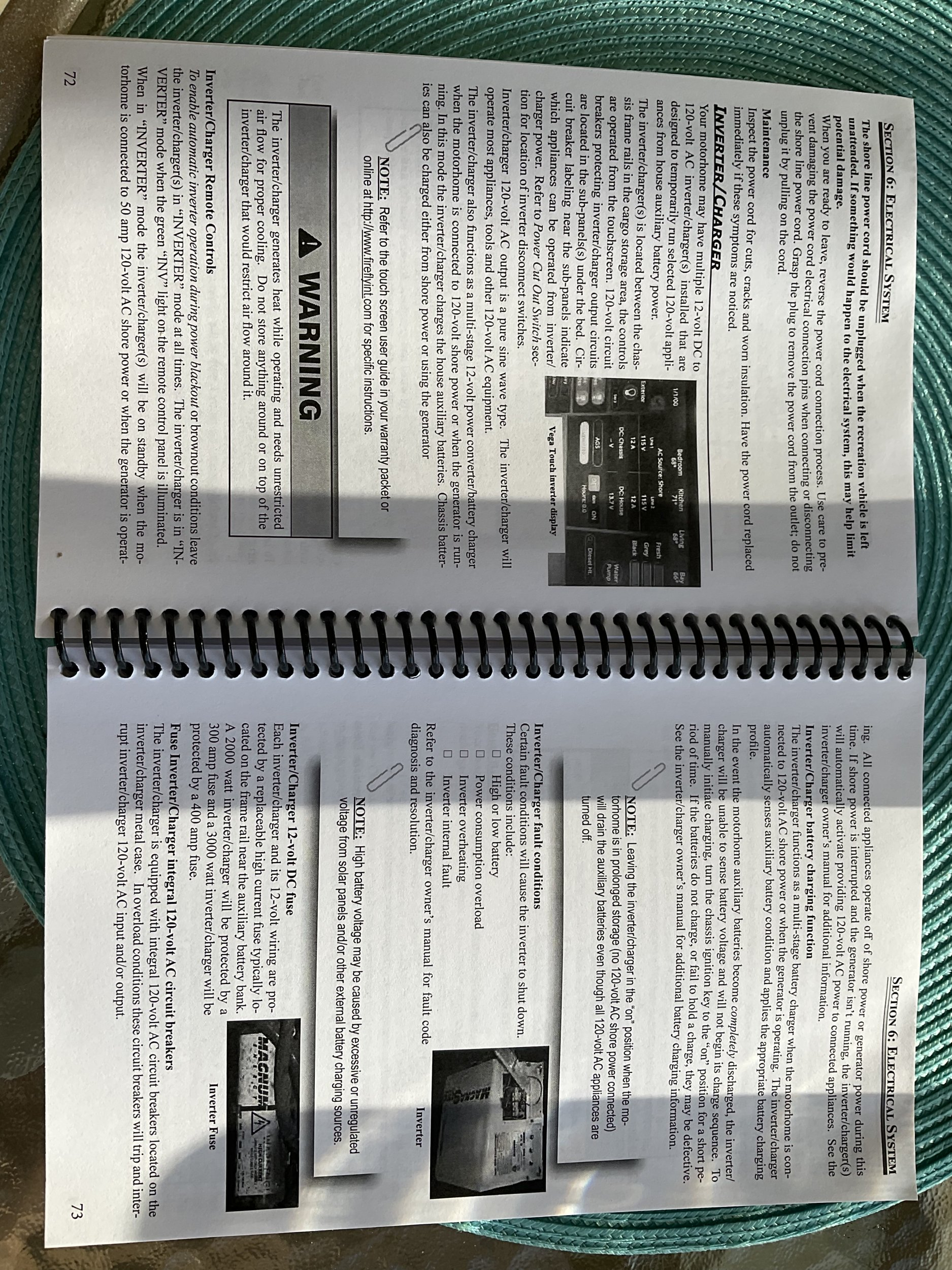 So here's the latest. Storage unit resist the panel breaker this am and reset my gfi. I get there hours later and gfi and panel is blown again. The guy next to me who pays for 30a plug-in says, try mine. I did and everything runs and I watch the ems on the surge protector. L1 121 volts(?) 0a, L2 says 117v and 21a. What.....? I go in and start hitting rv breakers and nothing is drawing those amps til I get to the inverter and basement breakers. Shut those down and 0amps at ems. 6amps with inverter off but I don't need that on while in storage so I've left both off. I then rolled the 100' 14 wire around the coach to eliminate coils and plugged that in. Waited 15minutes, all is fine.