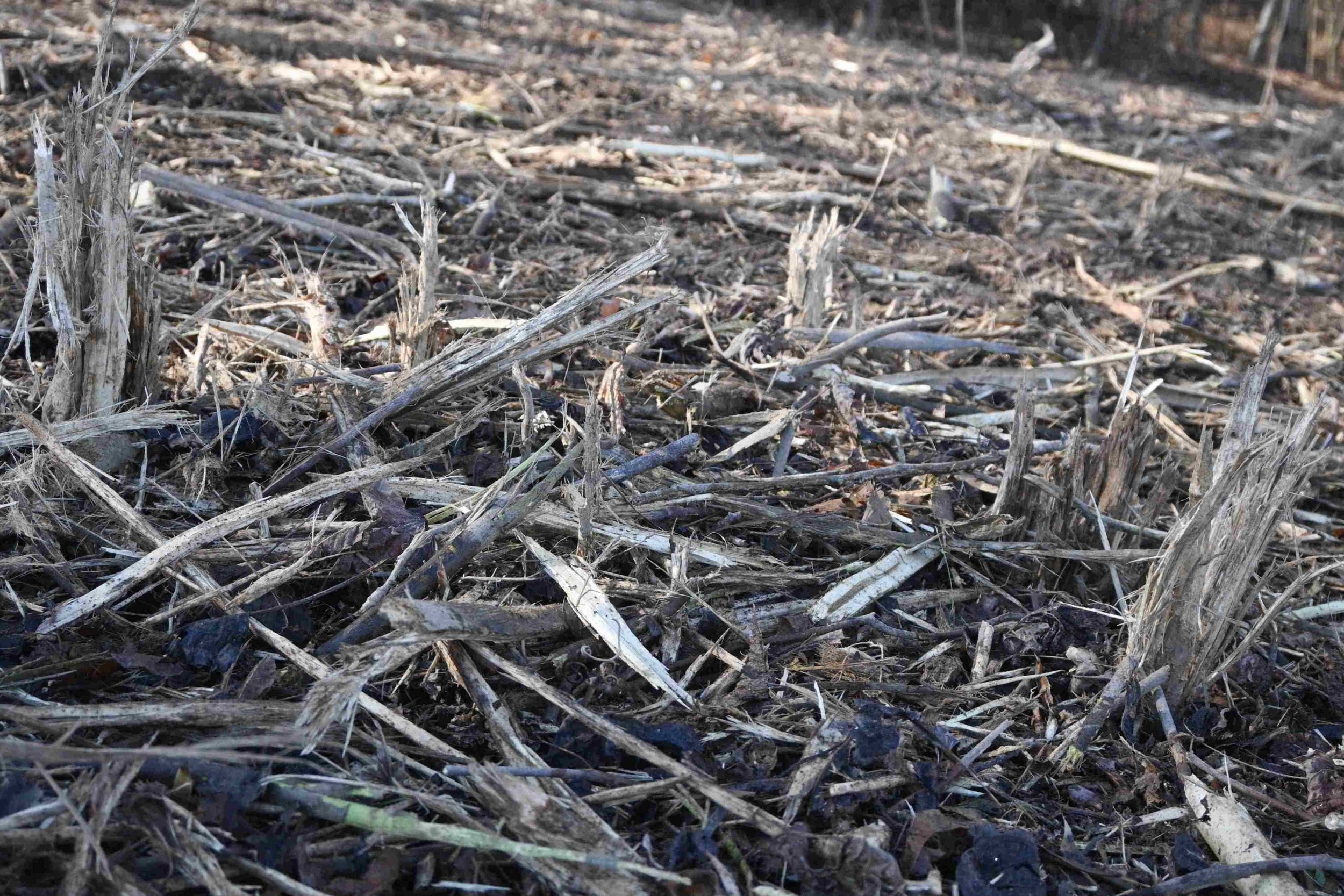 There is now about 4 inches of mulch material on the surface. Additionally, the mulching left behind some shattered tree residue including shattered nubs of tree stumps.