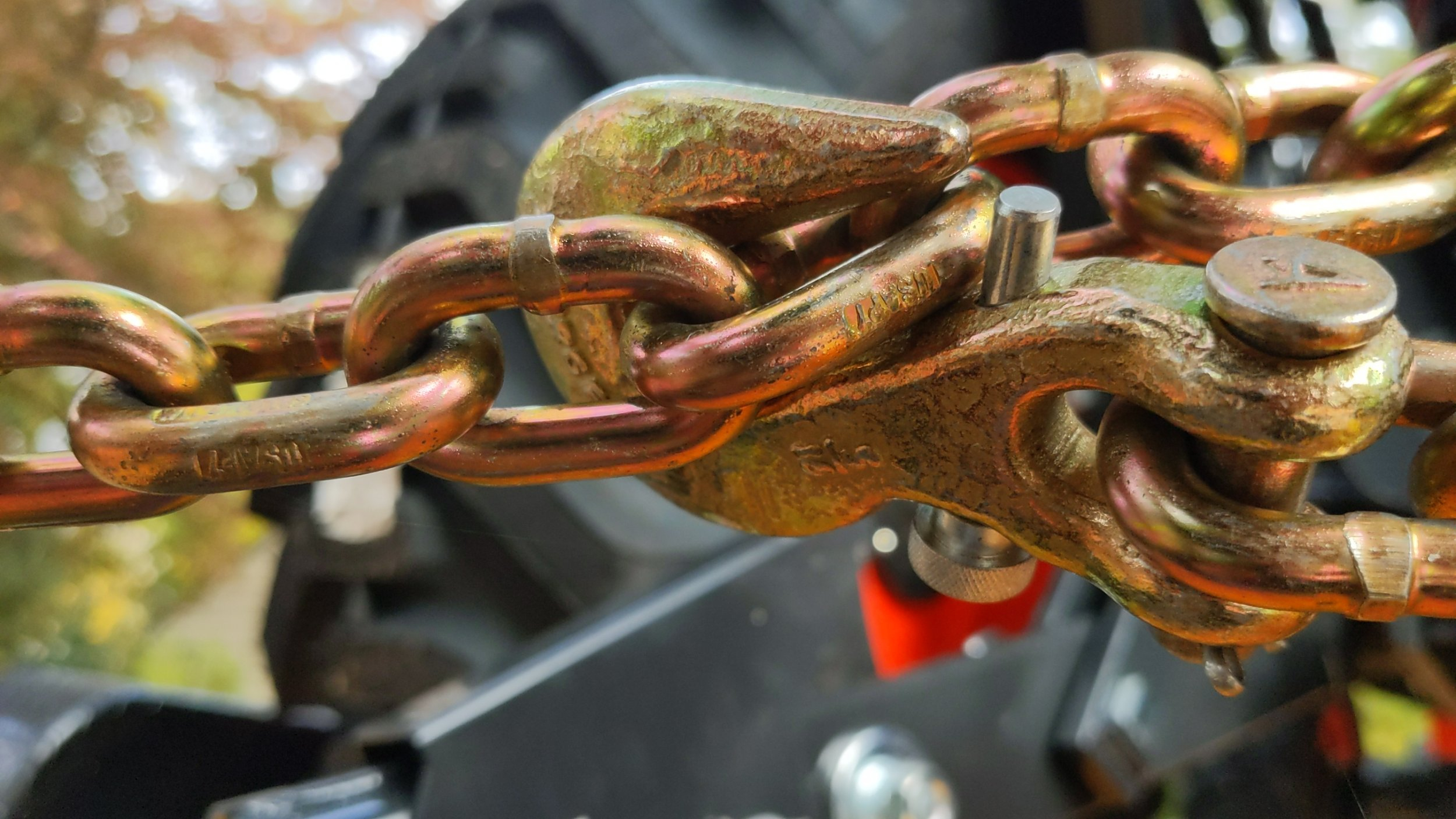 Edit: I'd also reccomend keeping your hooks facedown (open end being the face), that way if you get sudden slack they will not not fall off (yes, that is what the pins are for, but why fight gravity?). In your last image, both of the yellow speed-binders look to have one up and one down. If one can't get the hook facedown, they should face away from the strain of the load (the left one closest to the trailer faces towards the tractor it looks like), if they are faced away both the chain and hook should drop together instead of the chain falling out of the hook.