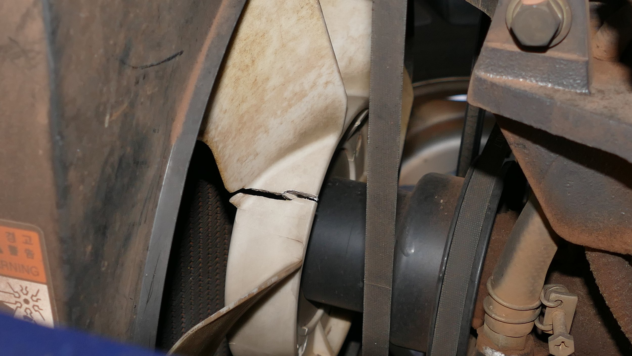 Well I searched the TBN archives, and could find no references to tractor cooling fan failures. So regardless of brand its definitely a rare occurrence. I agree with the OP, its hard to get a branch to penetrate inside the engine compartment, and especially without leaving some some trace of its presence. I suspect it may have been a faulty factory fan from the start, and only a matter of time it self destructs. Kioti does not provide warranty is surprising, its a rather low cost part, but labor cost is going to be big issue.