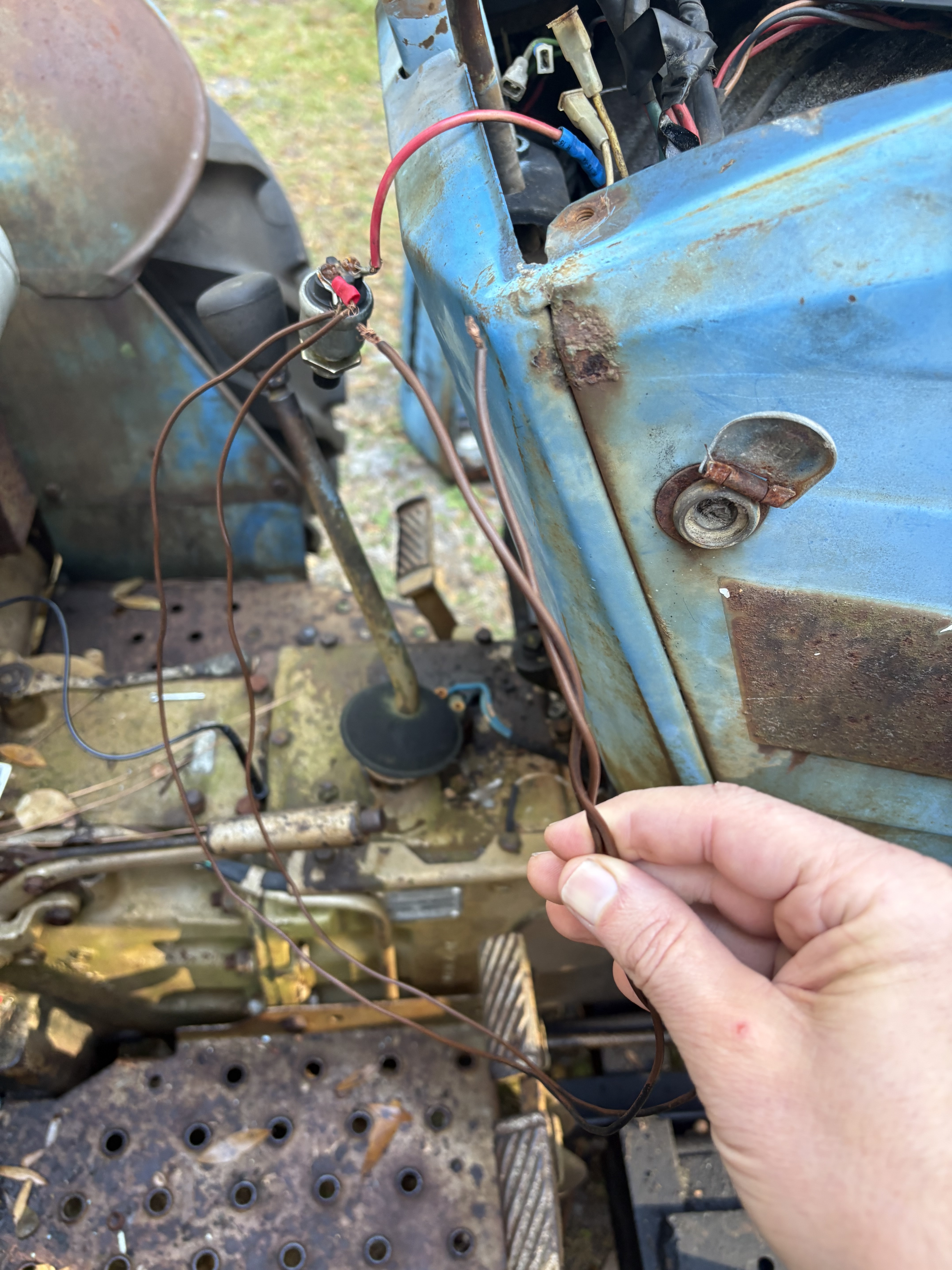 I’m really new to tractors. Have a Long 350 that ran rather well. I allowed my son to use it and when I went to start it up again, there were two longer brown wires hanging down by the brake pedal. I tried to start the tractor but the push button didn’t do anything. I took the dash loose and realized the two brown wires were for the ignition switch. I checked voltage on the side that was still connected and it showed 12.39V. When I push in the starter button, I get the same 12.39V on the brown wires. The problem is there are cut wires everywhere and I have no idea where the brown wires go to start the engine. I’ve attached pictures of the push button (with wires) along with a picture of the starter (The wire hanging from the starter I think was already like that.). Anyone have any idea where the brown wires should connect?