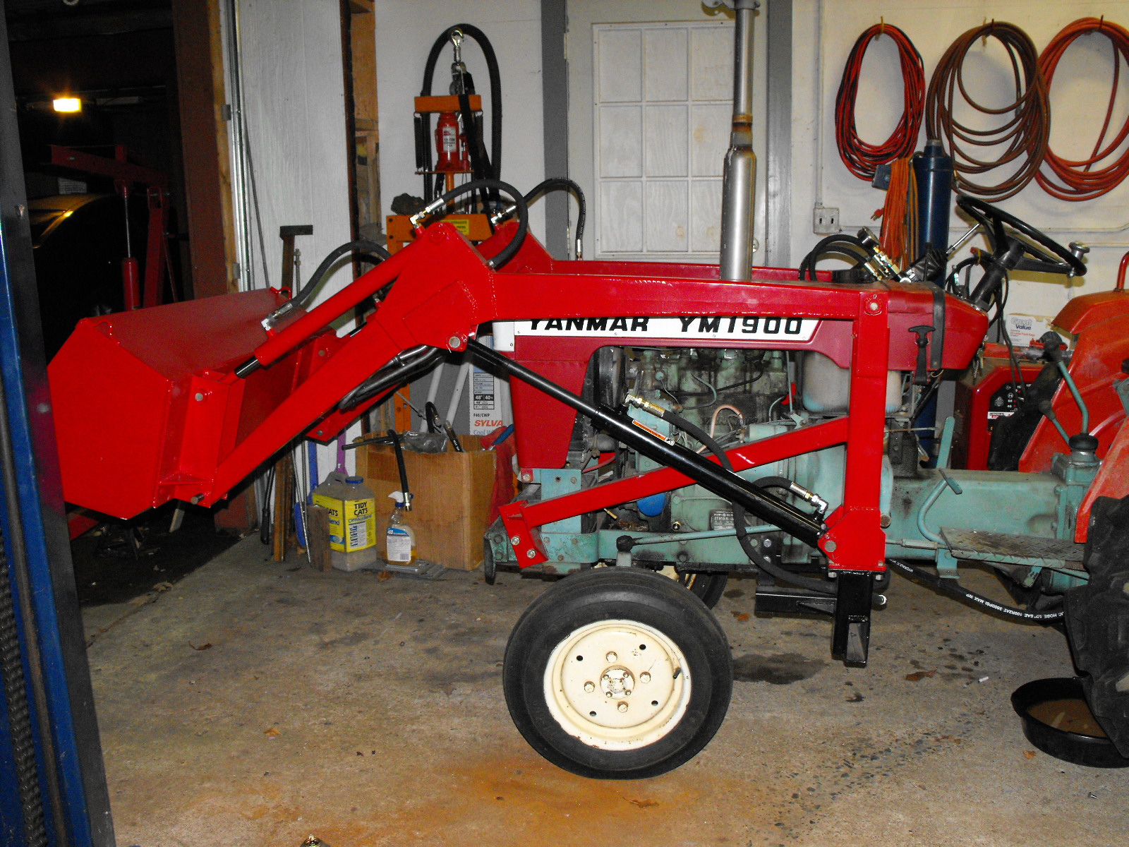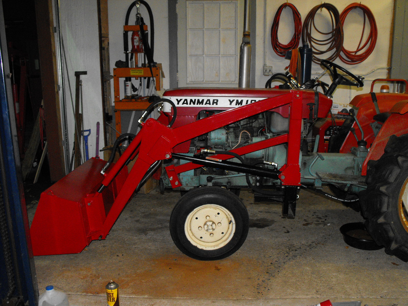 Here are some pics of the finished loader. Keep in mind this is my first (and last) attempt at building a loader. I plan on reworking the lines and hoses this winter but first I wanted to play with it to see what breaks or isn't right. I still have to machine the bucket pins for it to be complete.