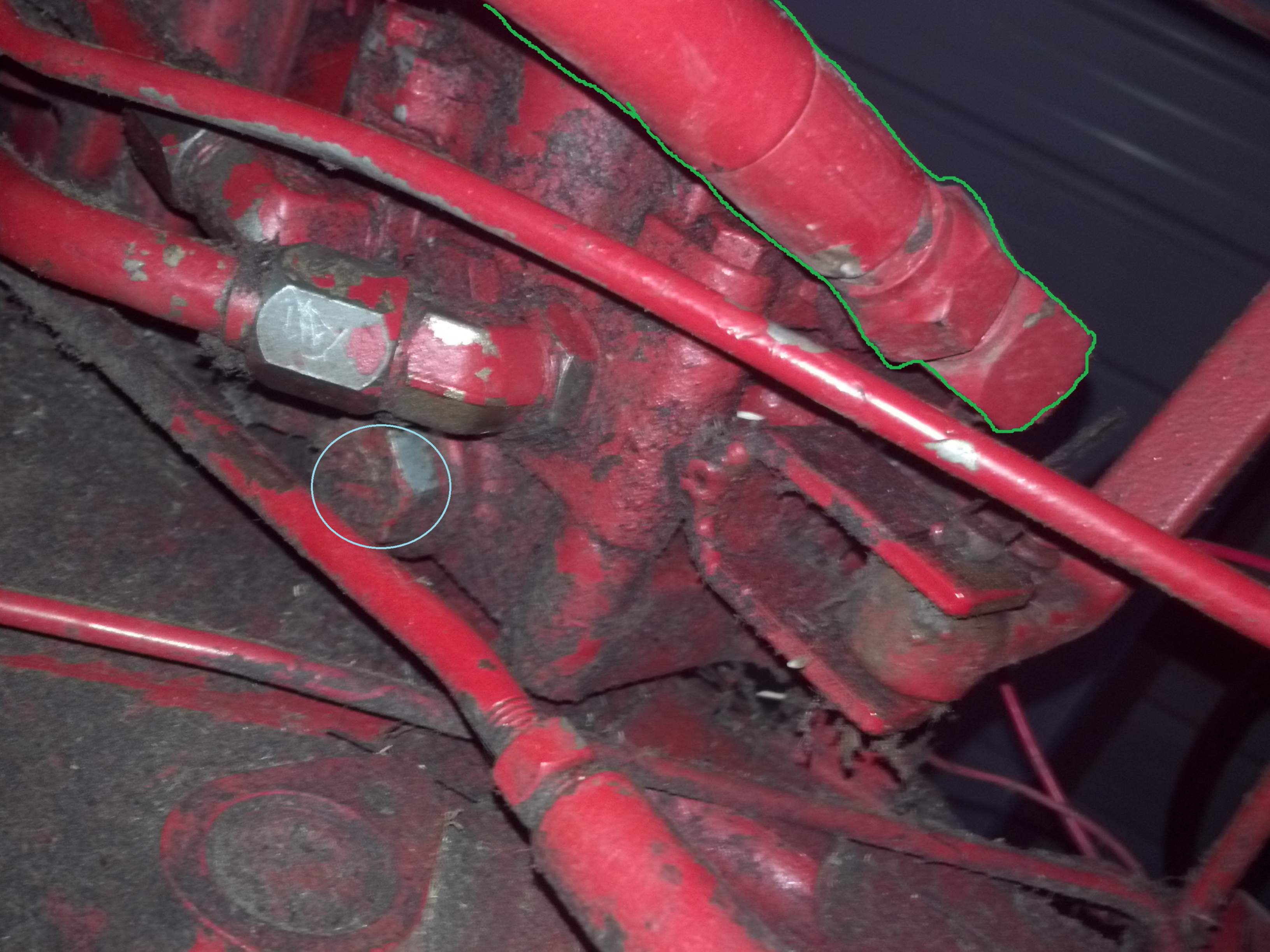 The next photo is from underneath and I outlined what I think is the return line, it loops around the axle and goes into a port on the bottom of the tranny. The blue circle is a plug that I'm hoping is another outlet for a supply line to my loader.