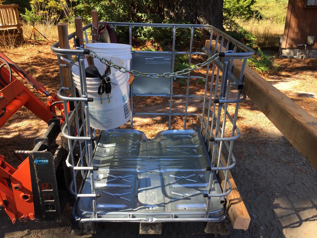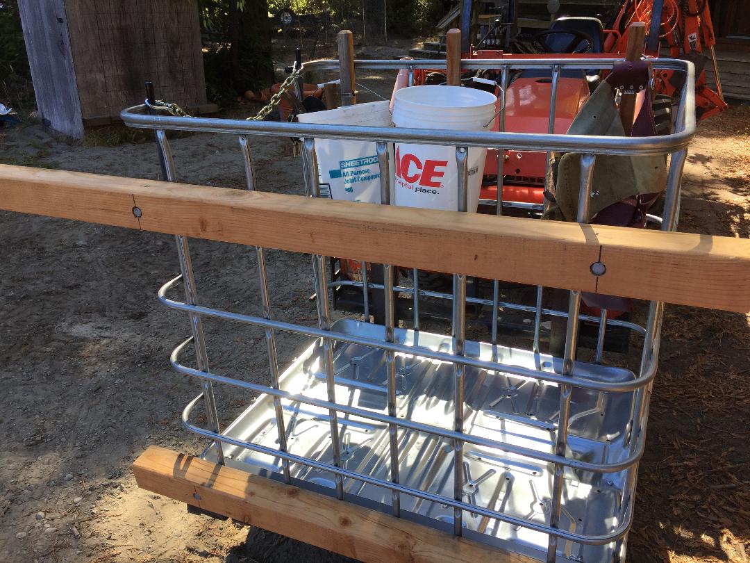 I am replacing all the windows and siding on the Mendocino place. Three buildings and a lot of work. Rather than ladders or scaffold I decided to make a work platform for the tractor. I have seen two or three TBN folk use IBC Totes, which looked like a good idea. So I did the same.