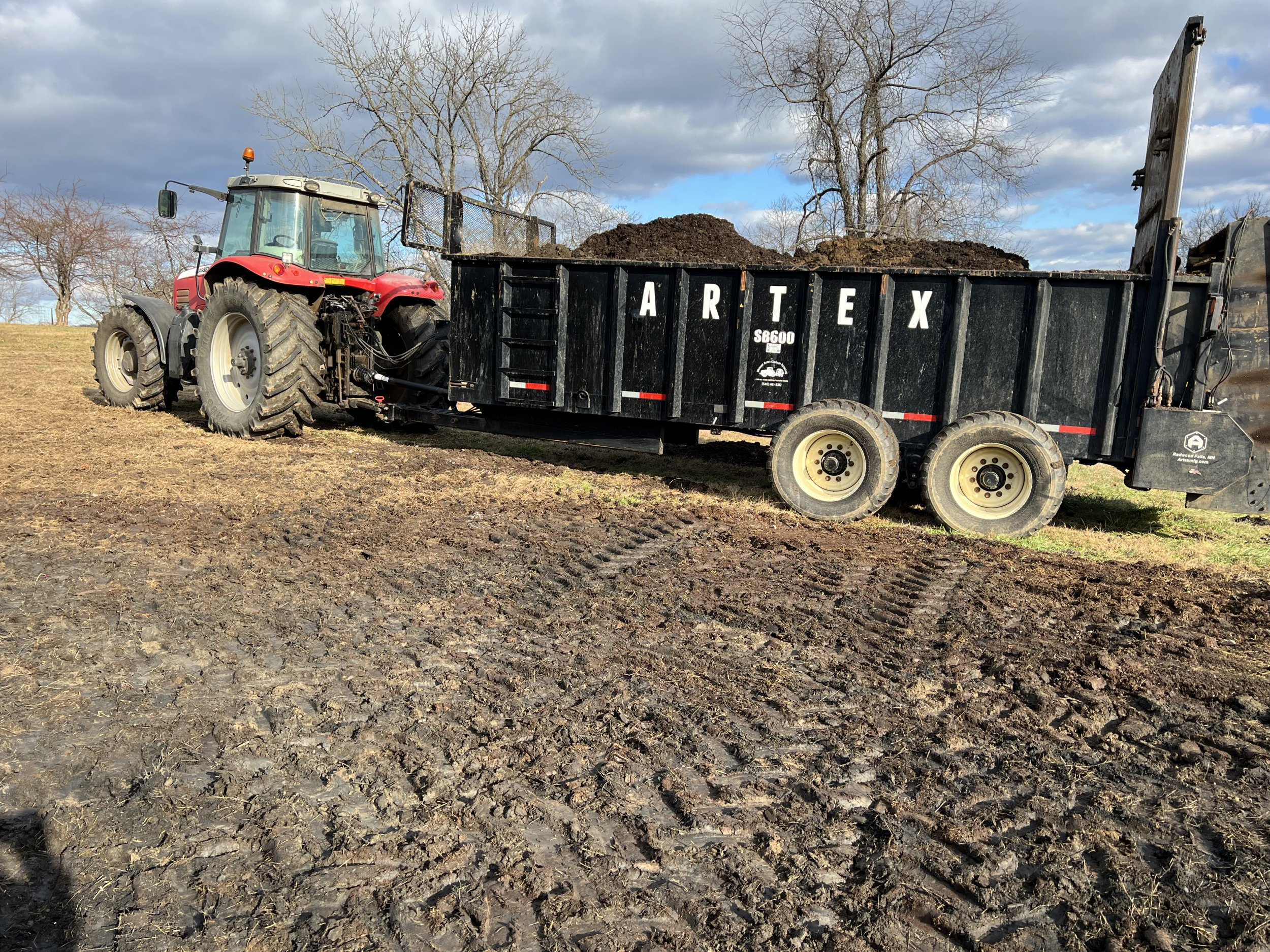 Mushroom compost doesn’t have any mushrooms in it, its the soil they grow mushrooms in. Once it’s used to grow a crop of mushrooms, it’s “spent”, so they take it outside on conveyors and truck it to our fields.