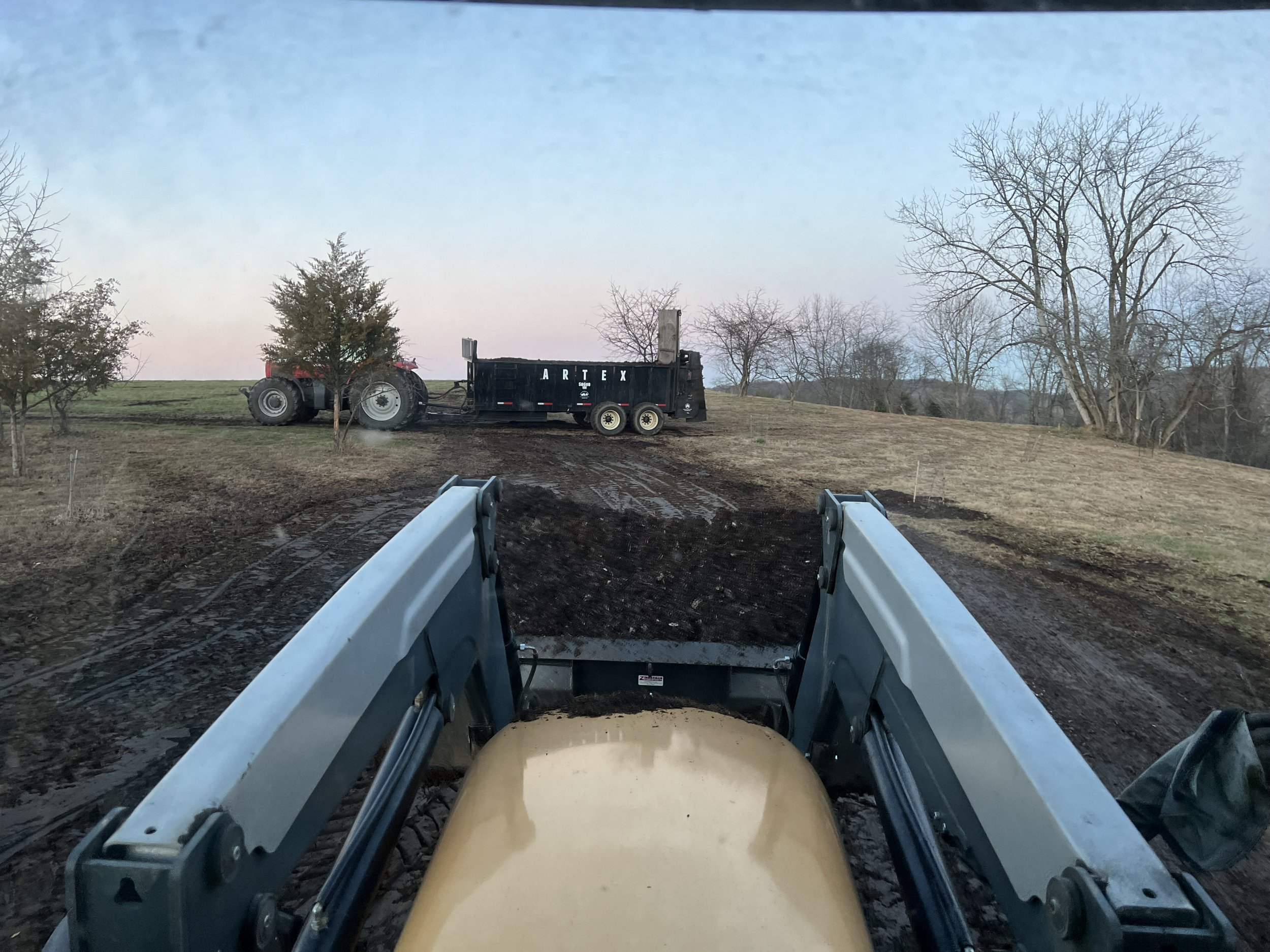 Here’s the Massey 7495 hooked up to the Artex SB600 spreader. I usually use the Magnum 270, but its getting some work done. Its a little light for hilly work, so need to be careful going downhill. Things can get sideways in a hurry if you’re not careful