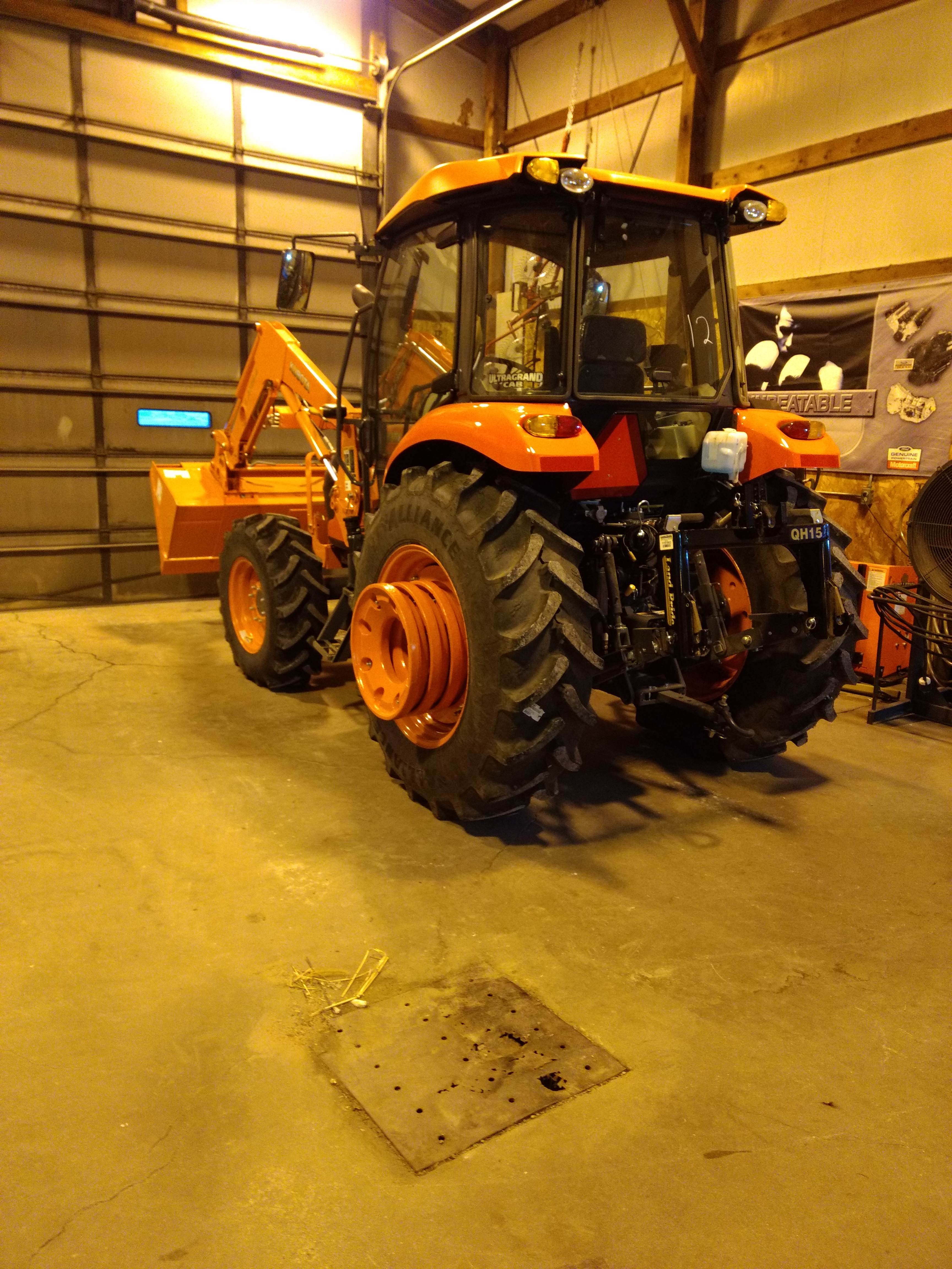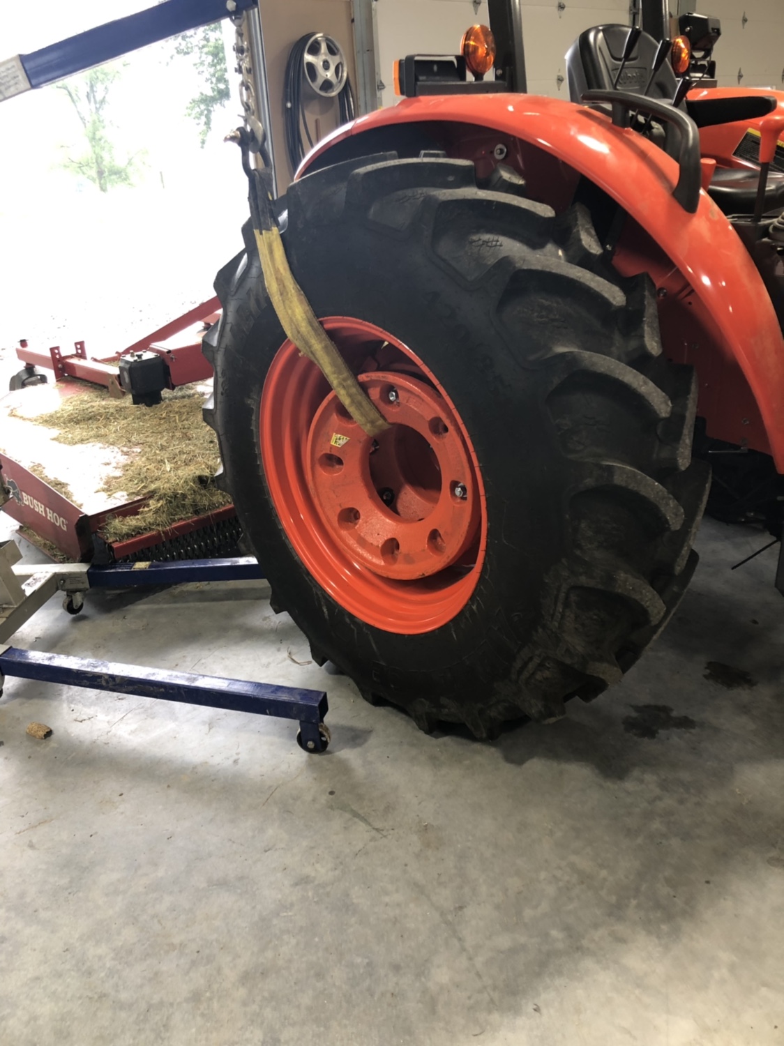 One side of weights on! The weights have been a bit of an issue with the tractor too. When I sent my quote to the dealer it had three sets of rear wheel weights, three per side. And it is worded (in my opinion) like each weight is 164 lbs. so I thought I was getting three sets of rear wheel weights each weight weighing 164 lbs. in realty I got two sets (4 total) with each weight weighing 82 lbs. according to the dealer Kubota will only let you hang two weights per side off the cast wheels. He did knock money off for that third set so I suppose he made it right. I may buy another set and put on though. I was worried about them sticking past the rim, and a third set would be perfect.