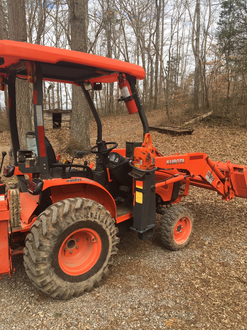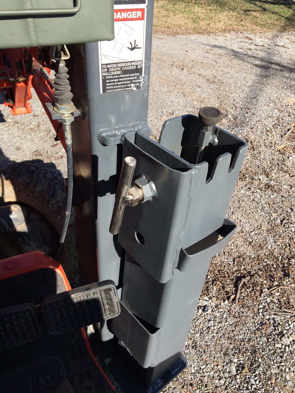 Scrap pile chainsaw, chain and tool holder. 5” square tube and 2x5” rectangle tube split. Bolt with spring for clamp. Doesn’t really need a clamp. Uses factory plastic blade guard which helps moving saw from shop, truck or worksite. Note adjustable rubber foot to add support for the saw. 1/2 plate on bottom. Welded to loader upright. Can safely carry chain, saw or tools on tractor.