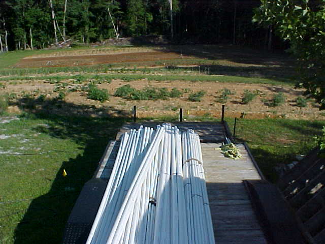 Looking down from top center seeing most of the garden and also the piping for the irrigation system laying on my trailer.