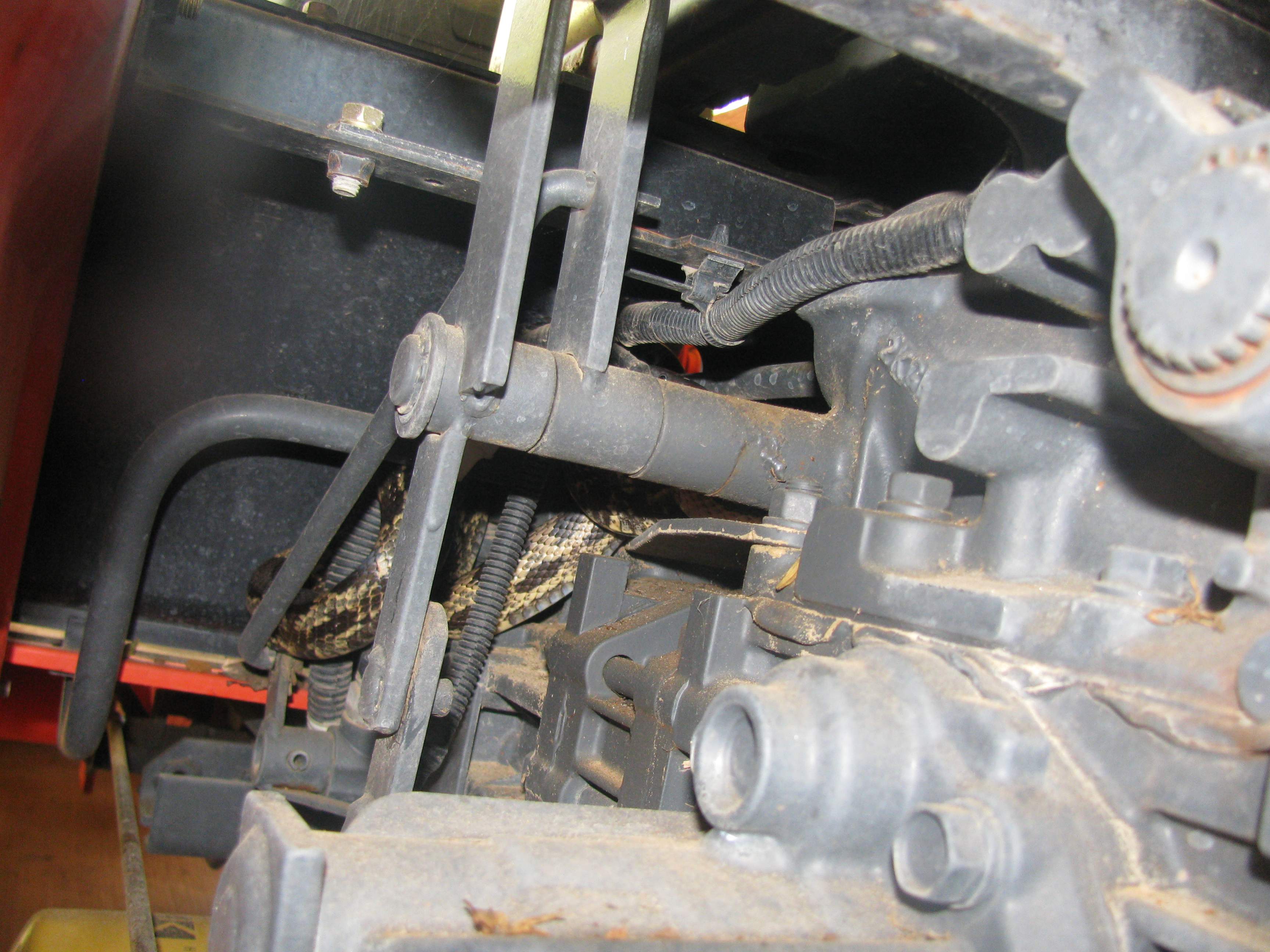 I will be checking underneath my seat before I hop on from now on. This dude was coiled up underneath my seat this past Friday. By the time I got the camera he had moved down just above the transmission. I walked around the tractor to put the camera down then walked back around to get a better look but he was nowhere to be found. I don't think it is a poisonous one but I am no snake expert.