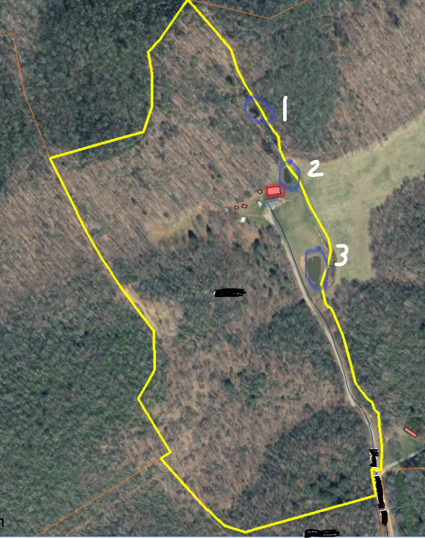 The house sits in a "bowl" (taller terrain to east/north/west and has 3 spring fed ponds. Aside from about 10% field grass around the ponds, the balance is moderately wooded and VERY hilly... very little "flat"/level ground. There are old logging roads around the north/west perimeters that access the woods.