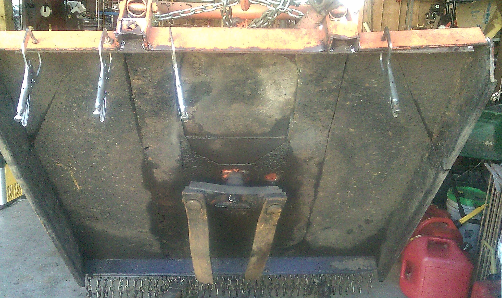 I went to hook up the bushhog the other day and I noticed that the deck was sagging in the middle. Took a closer look and the welds broke between two sections. I got it in the shop and picked it up to start cleaning it up and this is what I found:
