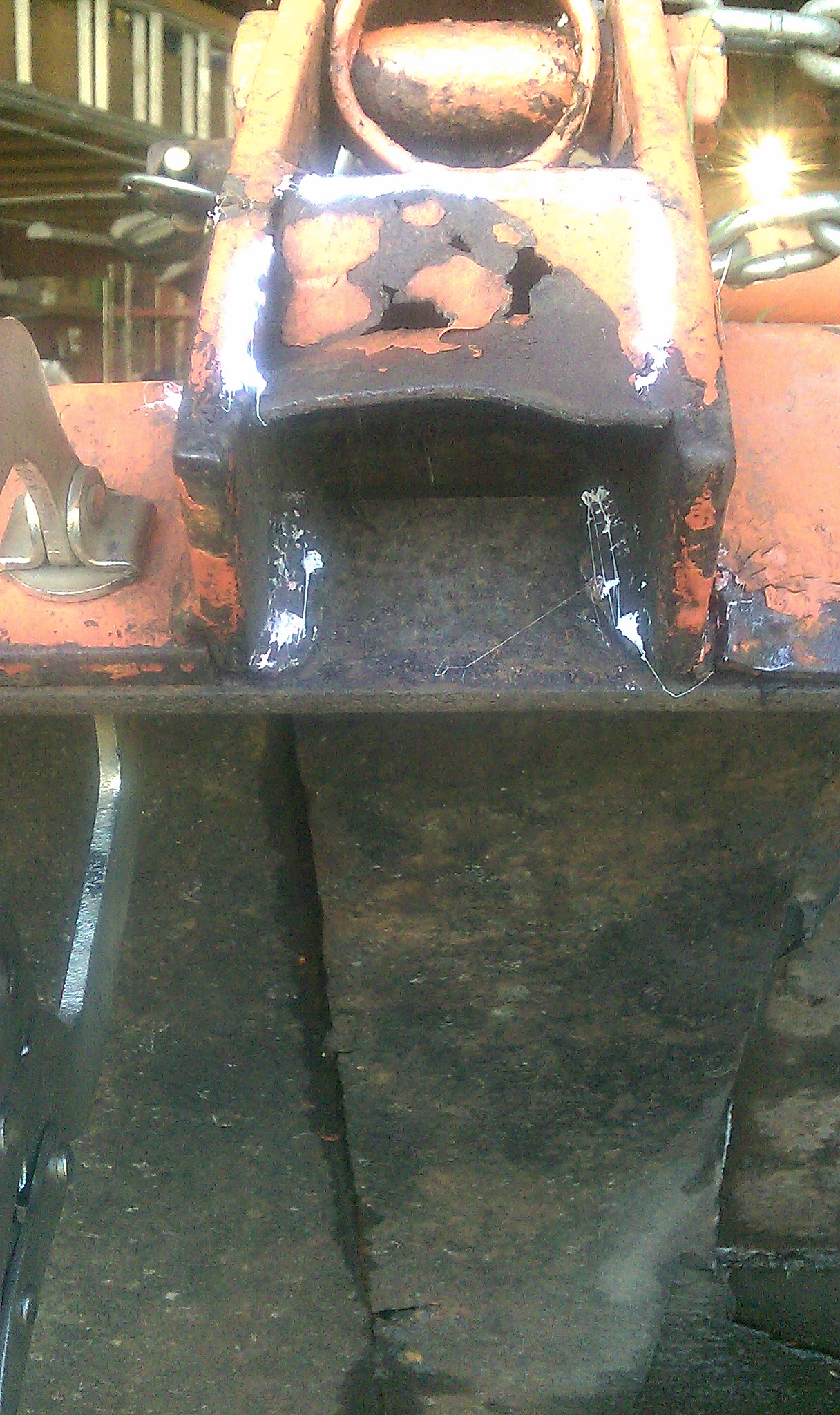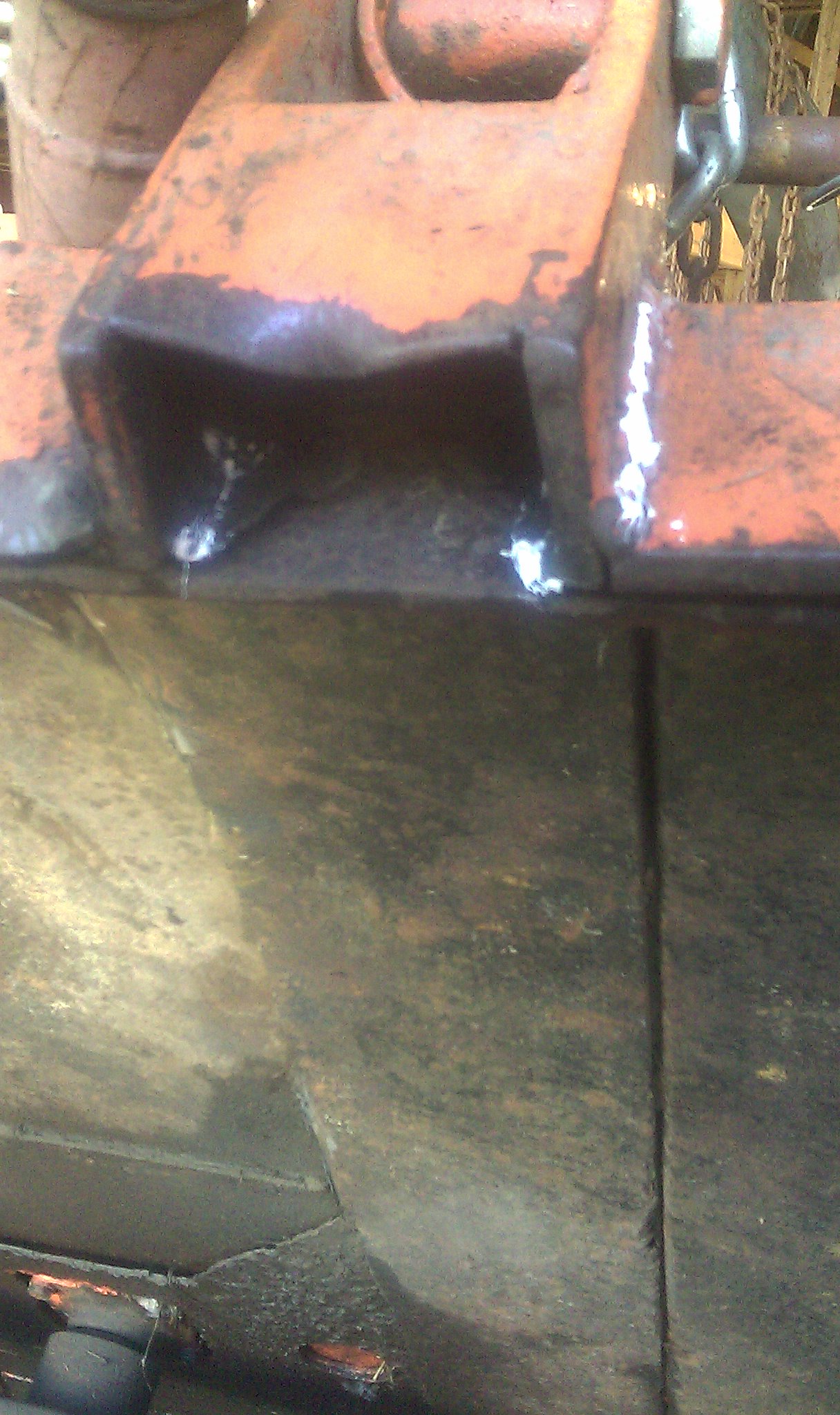 White lines are where I am going to grind out the weld (or crack) and re-weld. I plan to re-weld the cracked/broken sections, then weld a backer all the way across the front to tie all three sections together like the chain holder does on the back. I have a piece of flat stock (~2.25" x 3/16 or 1/4") that I am looking at using as a backer (shown clamped in place). Should that be adequate, or should I get a piece of angle to go in there?