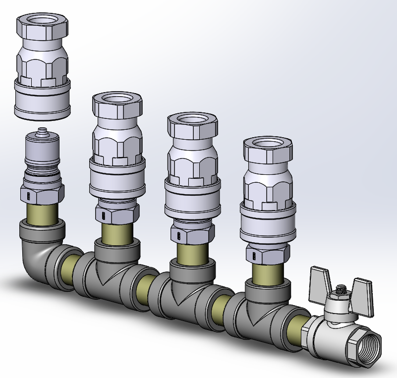 I am certainly not locked into this design, but it'd work. Maybe there is a less fitting intensive design. I've seen those air manifolds (http://ecx.images-amazon.com/images/I/51avnKHPgDL._SX342_.jpg) but it's a 3-up with a spot for a valve, not a 4-up. Plus I dunno about room for the other fitting half.