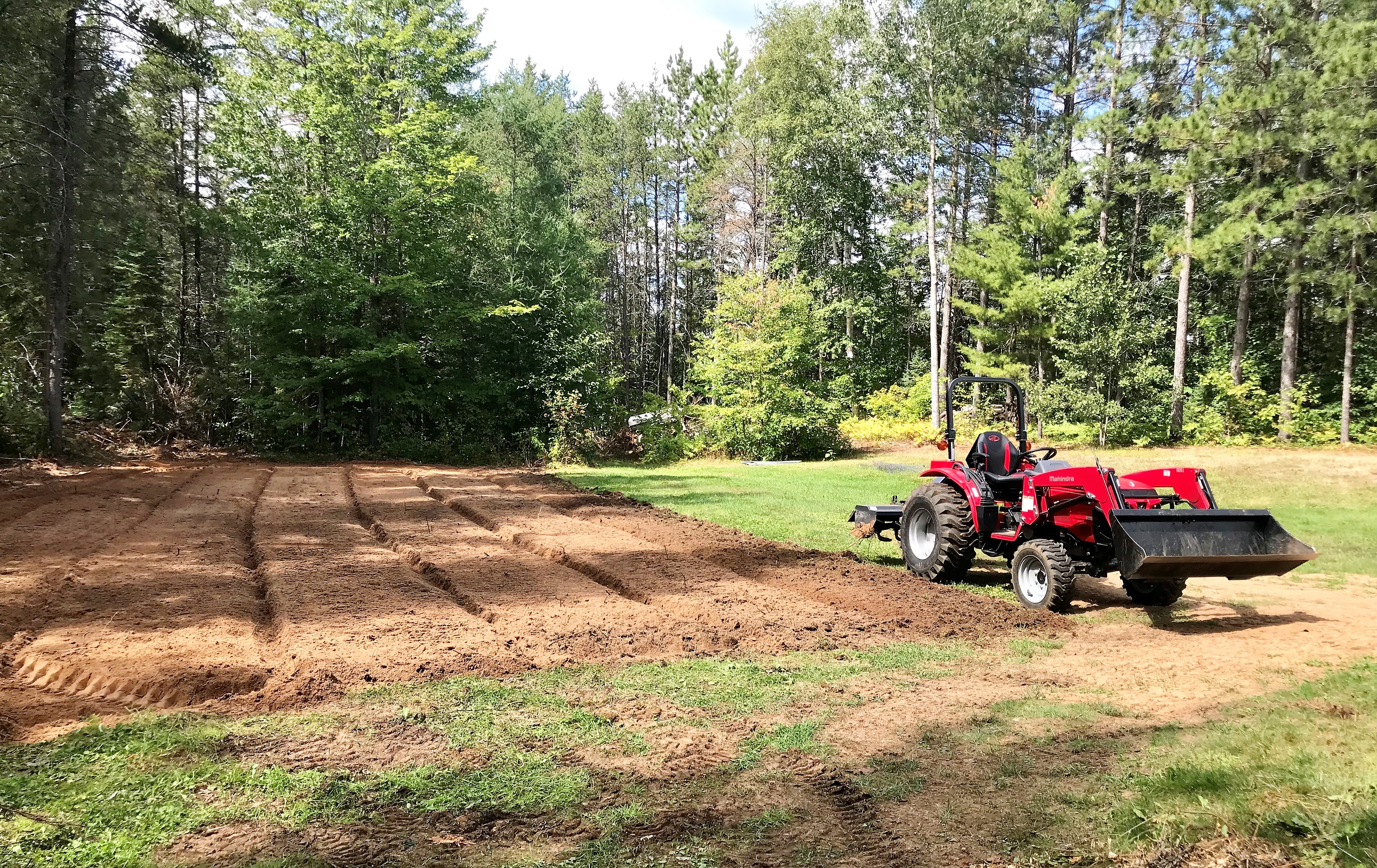 So I got out the lopping shears and cut the poles. I made a big pile in the middle and burned them. After that it was tractor time. I scraped the rooted up topsoil off with the FEL bucket and went to work on the stumps from the trees I had originally cut 8 years prior. The Mahindra 1626 was a champ.