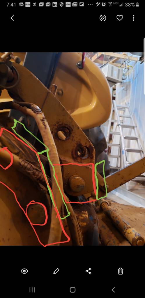 Thinking to run 1/2 plate basically around the bracket like below. Left to right: Catch 3 or 4 housing bolts on each side. Run 1/2 in plate next to the center housing with a bend for stiffness and a notch around existing welded on lower pipe. Then run a plate back on either side with holes for the pin (have to be a longer pin ) and then tie them together behind the bracket. The bracket between the pins will still be installed from the top. I know this is a pretty rough picture... but with gussets I think I am in the ballpark... or maybe I am overthinking it. I do have access to a well equipped shop. ! Screenshot_20200114-194302_Gallery.jpg