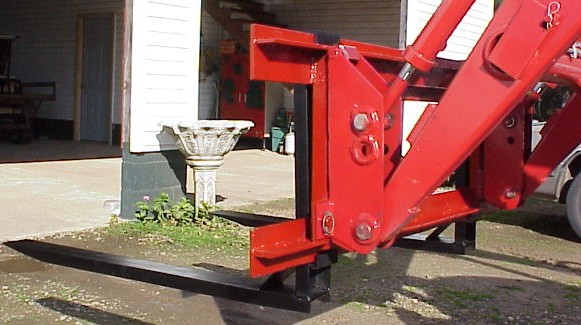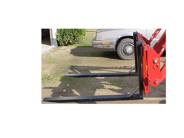 Just wanted to post a pic of the forklift attachment I made for my loader. The forks are just made from 4" channel and I expect them to give some. The frame is made of 4" channel and 3/8" plate. It took a good bit of tourch work and welding but I finished it today. Tried it out today and was suprised at how well it did. Moved some 3' x 20' metal roofing that had been covered with kool seal. Each sheet weighs between 50 to 80 pounds. I moved between 5 to 10 pieces at a time and nothing broke. Anymore than that and it would lift the rear of the tractor. I am real pleased with how they perform and I built them for less than $75.00. Not bad for an ole country boy from Alabama.