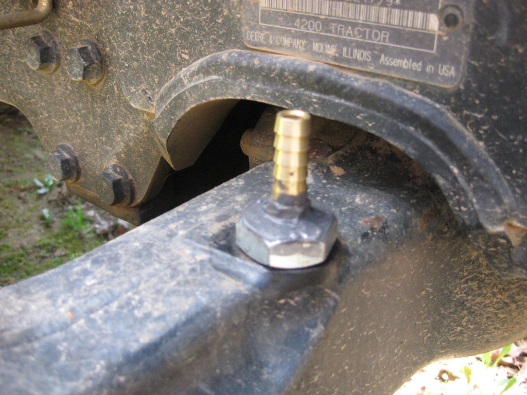 For those that haven't been following along.... There seems to be a rash of axle seal leaks on the 42/43/4400 series of tractors. I'm guessing its because the axle isn't vented and the pressure buildup on older/weaker seals is too much for them. I wanted to vent my axle which is the "normal" way of doing things in the automotive world (and even the rear of the tractor is vented). I made a fill plug vent that I really liked (pics attached). But during hot weather when parked on an incline, the air and oil expanded right out of three feet of vent tube. Dfkrug and I decided that the right answer was either to vent both sides of the axle or the very top of it. I chose the very top of the pumpkin even though its more work.