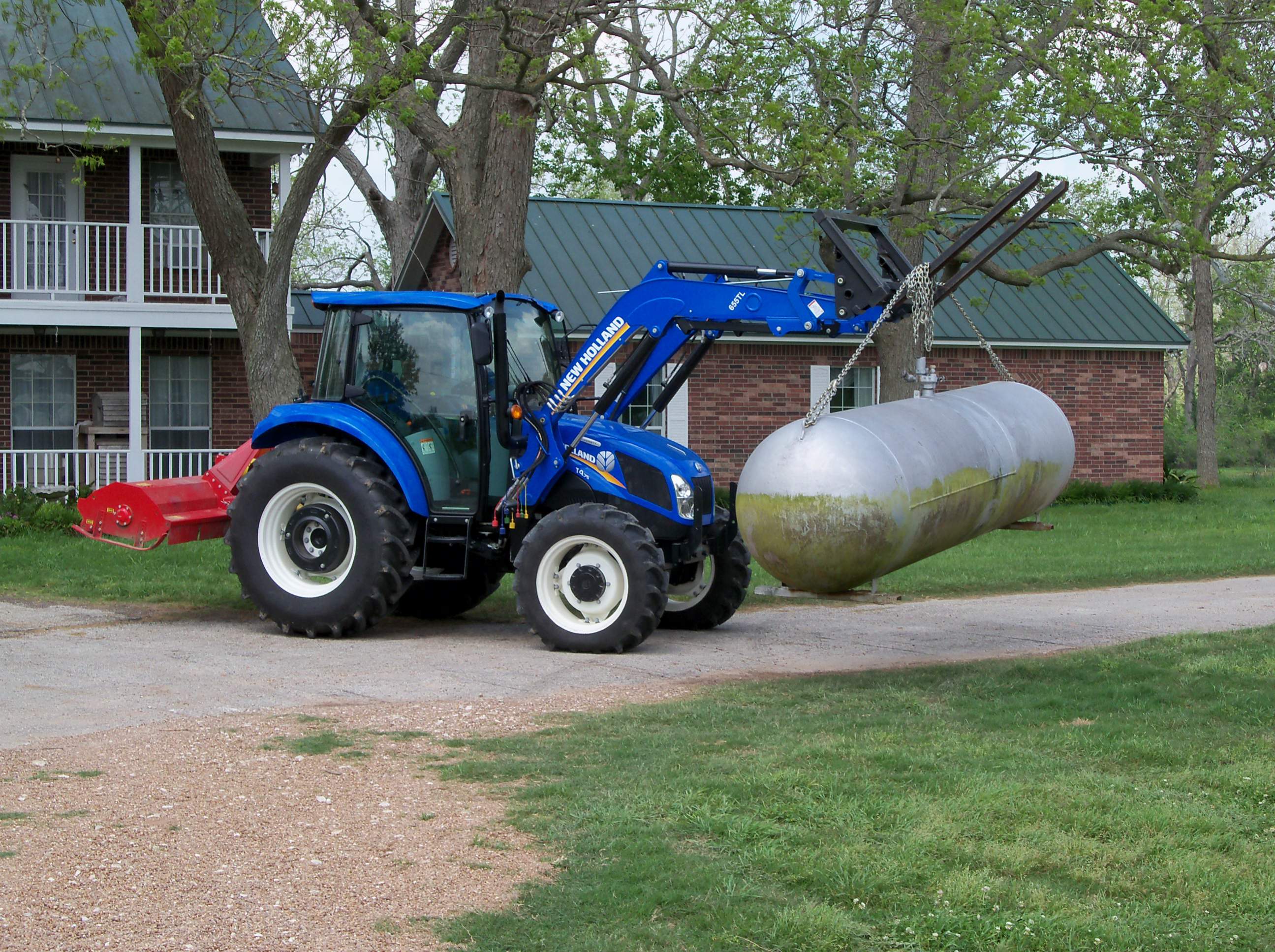 I recently purchased the property next to mine and needed to move the Propane Tank from that home to mine. Today was the day of the move.... Tractor that I own is a Mahindra Max 28 to make the move. Not too far maybe 1/2 mile between where it was and where it needs to go. I realize that this is probably not the right tool for the job but must suffice as it is the only piece of equipment I own- lame excuse I know; there is redneck blood in me!
