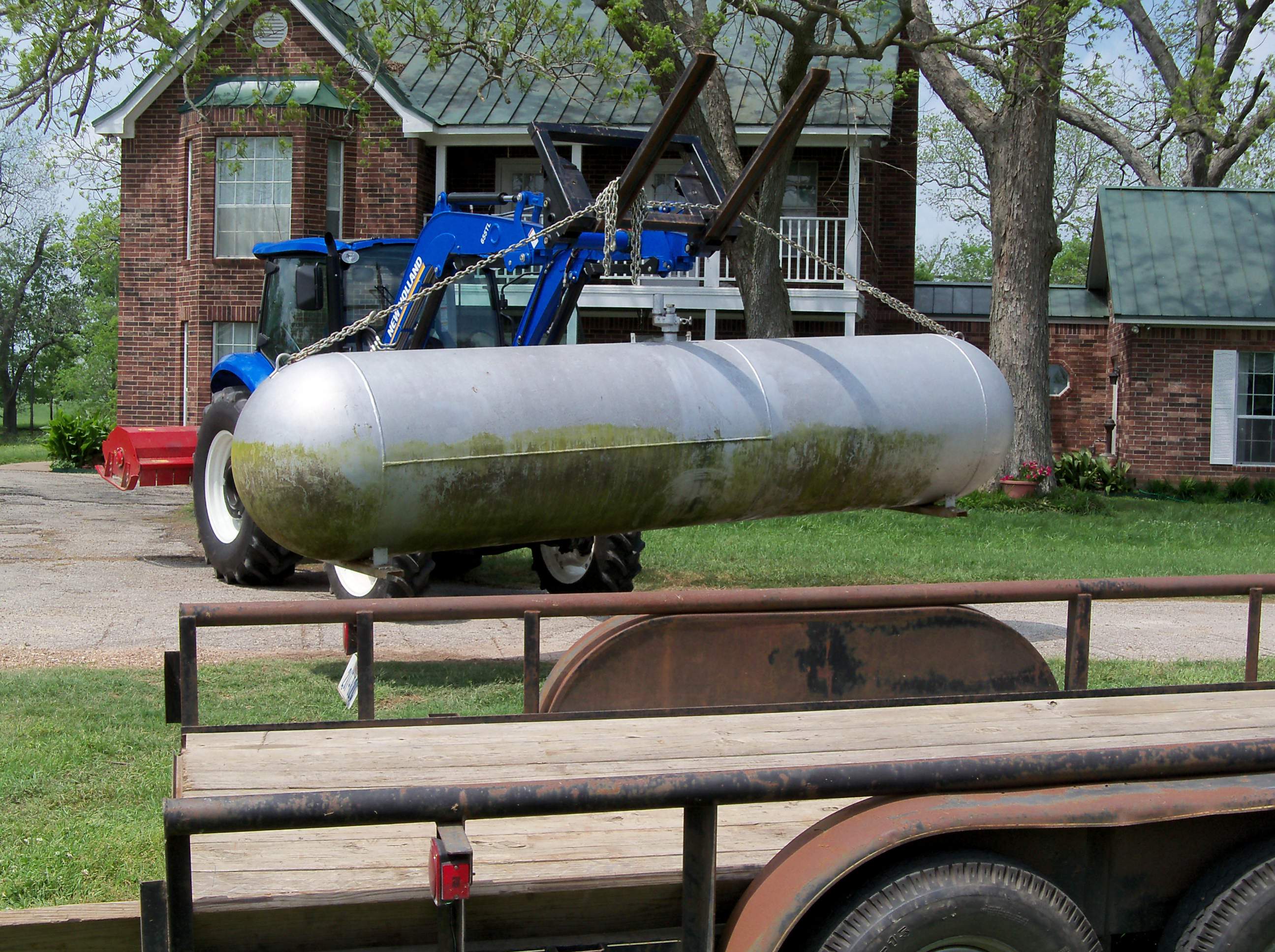 I Lifted the tank with a chain wrapped around the bucket attached to the welded hooks on either end of the tank. I moved it maybe 5 foot and could not control the swaying of the tank and any bump in the sloped gravel road gave me the heeby jeebies. So I had to rethink it; took 2 large ratchet straps and used the bucket to cradle the tank and secured it firmly to the bucket. The bucket on the tractor is small compared to the size of the tank - another clue that what I was doing was stupid.
