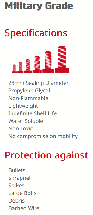 Tyre sealants for military & combat vehicles. Defend your tyres against bullets, shrapnel & debris. For light & heavy tactical, all terrain & patrol vehicles