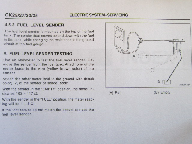 I have a CK20s that has developed a fuel gage problem. Until recently it was working fine. Now it reads full all the time even when the power is turned off. Can someone give me some help and ideas before I start tearing things apart. Thanks